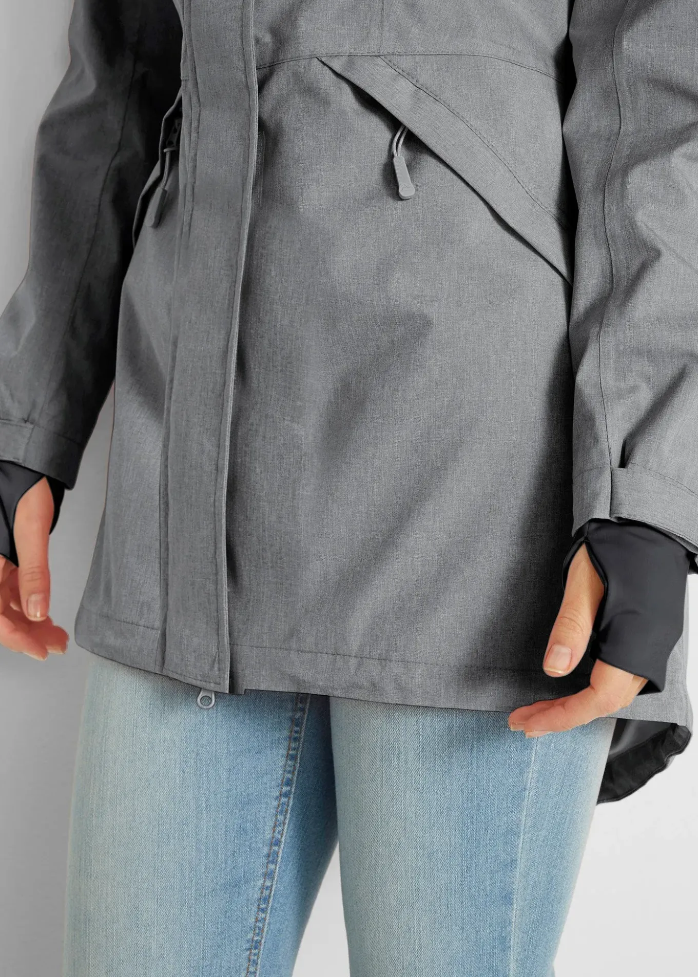 Capuche amovible, poches zippées, mitaines, fermeture zippée avec protège-menton, ampleur réglable à la taille, poche intérieure avec sortie pour câble d’écouteurs, colonne d’eau 3000 mm, long. env. 90 cm.