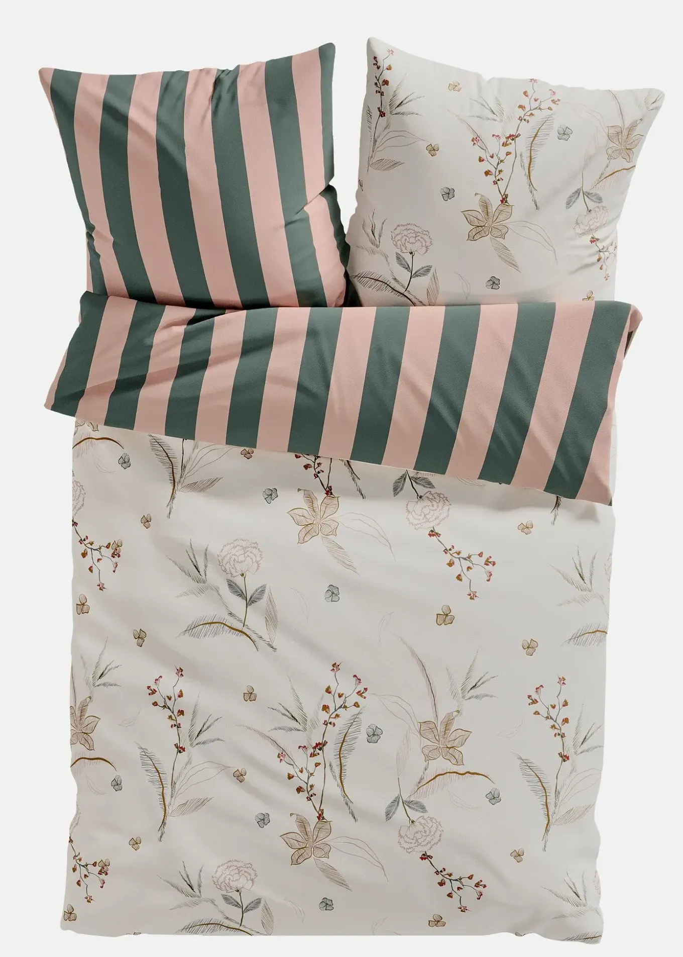 Cette élégante parure de lit réversible allie un motif floral romantique d’un côté et des rayures chic de l’autre.
