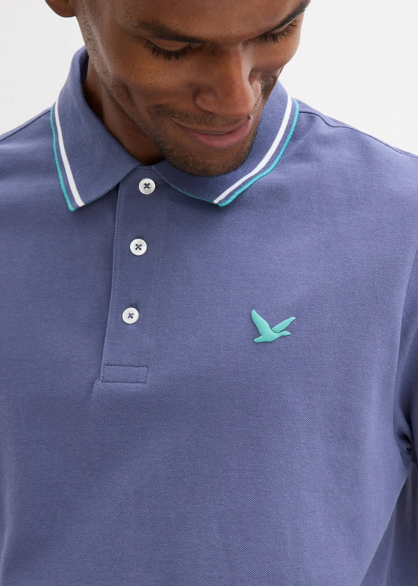 En matière piquée avec revers de col contrastant.