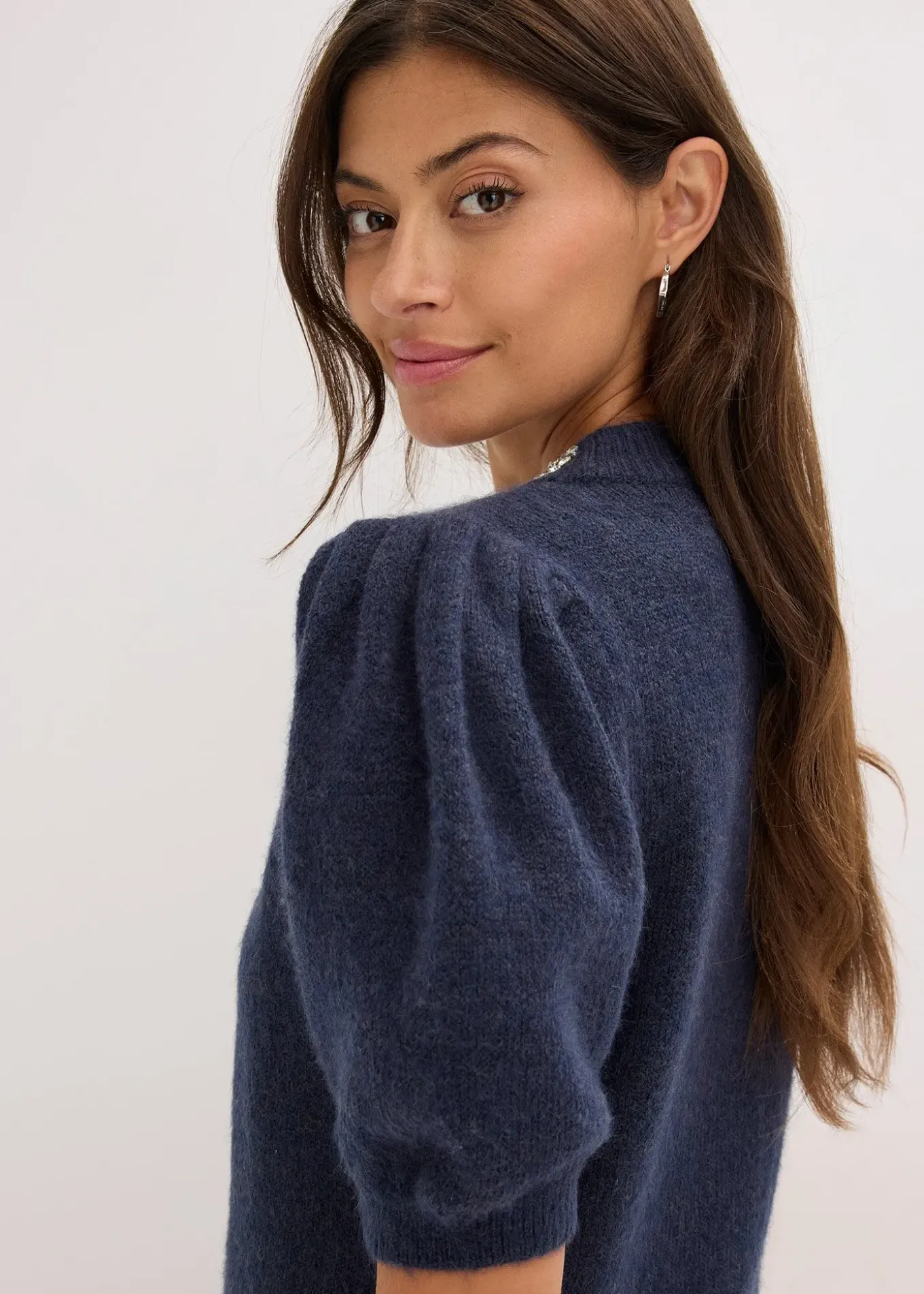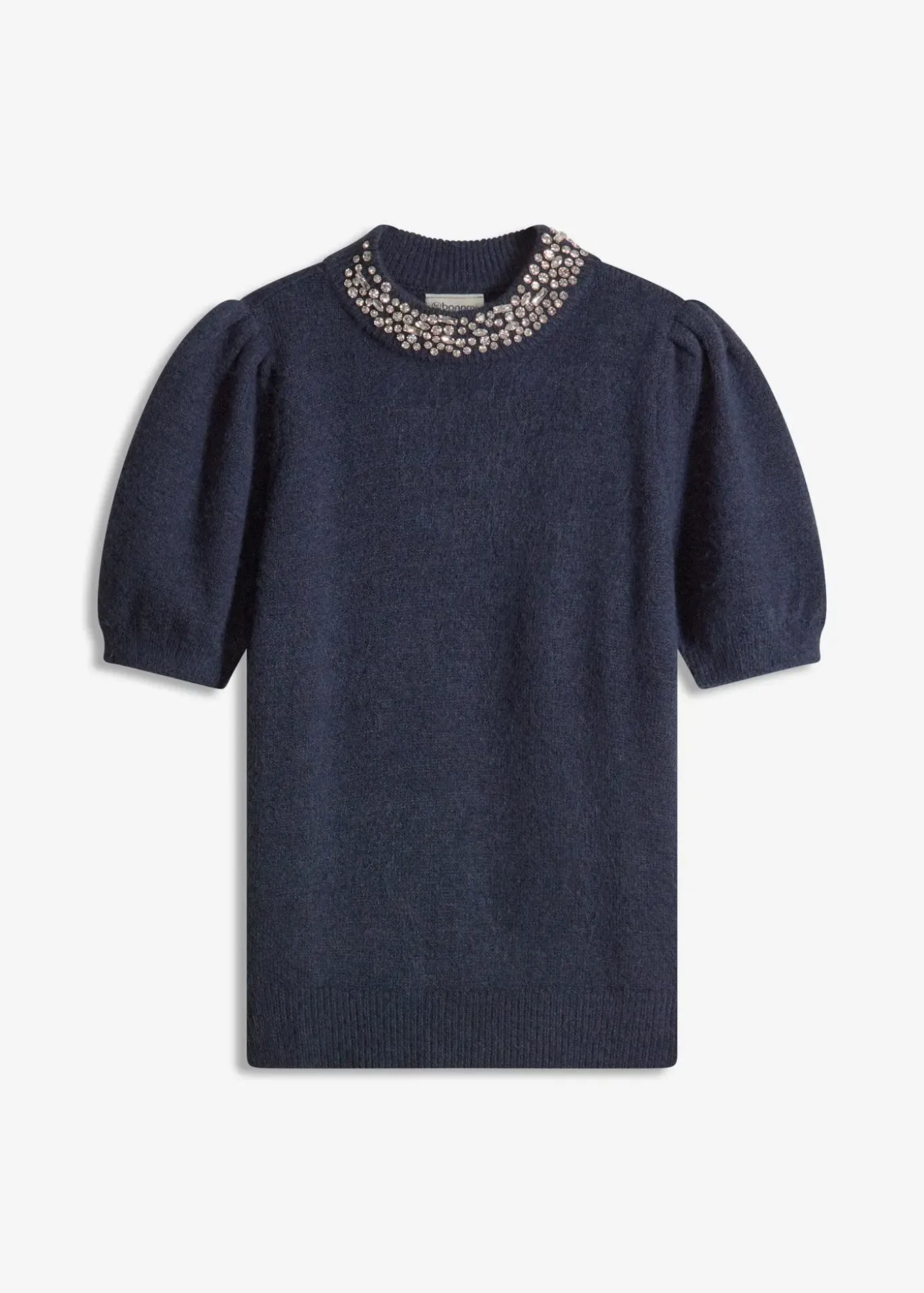 Pull en maille douce à manches bouffantes et application de strass à l’encolure devant