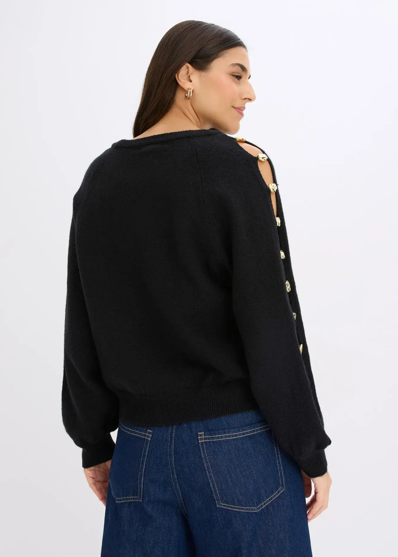 Pull à col rond et manches longues fendues avec application de perles métalliques dorées