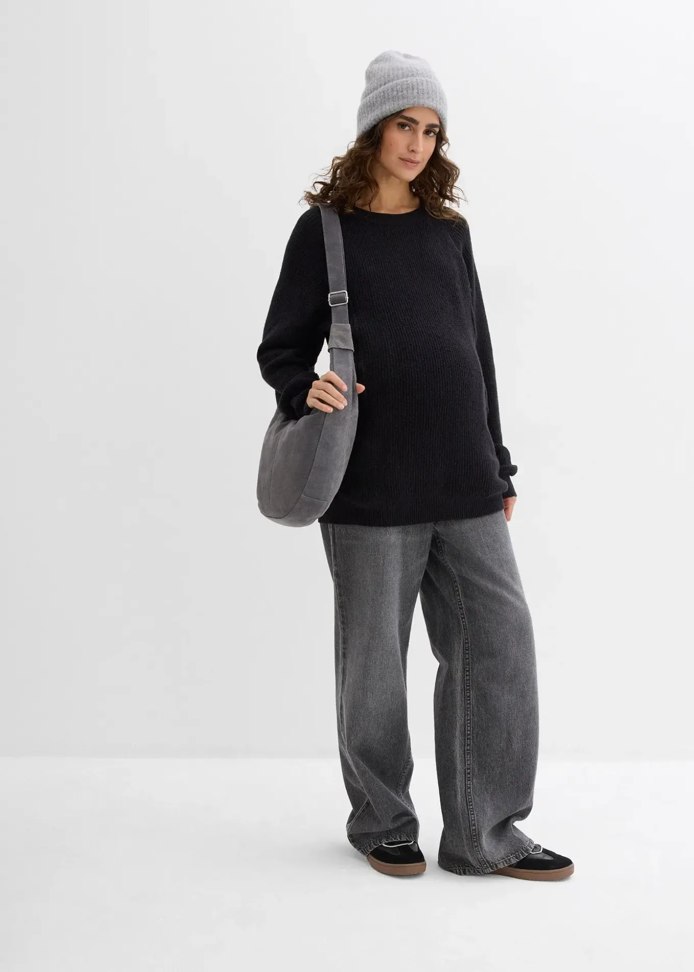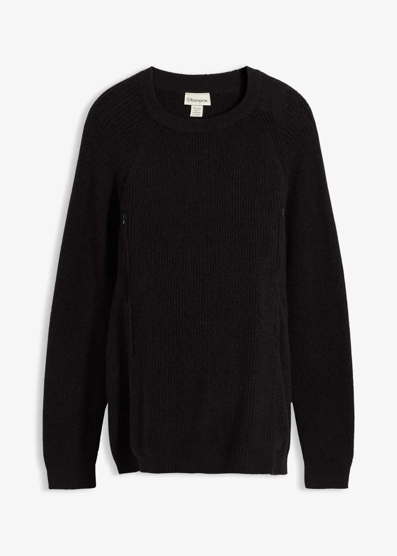 Pull à col rond en grosse maille douce pour la grossesse et après. Ouvertures zippées quasiment invisibles sur les côtés pour faciliter l’allaitement, doublées de tissu pour protéger bébé et éviter tout contact direct avec la peau.