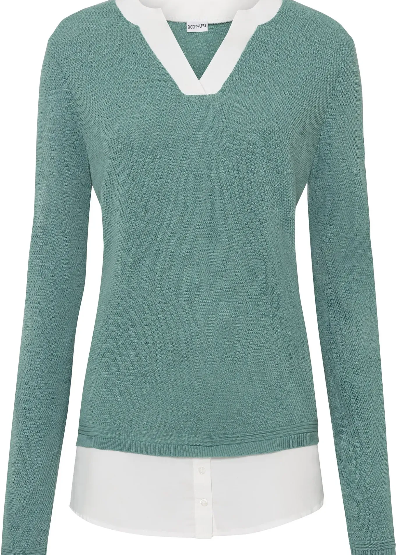 Pull féminin légèrement texturé de BODYFLIRT avec un joli empiècement chemisier et de petites fentes sur les côtés. Petit col montant avec une encolure V. Base chemisier boutonné.