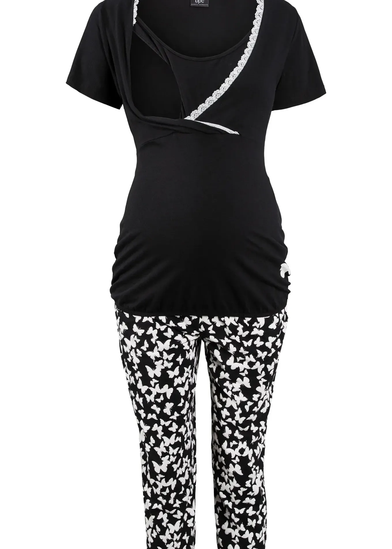 Ce pyjama 2 pces. de la marque bpc est un joli basique pour votre grossesse : composé d’un pantalon confortable à porter par dessus le ventre et d’un T-shirt avec dentelle décorative. La matière coton de qualité et la coupe flatteuse procurent un confort élevé.