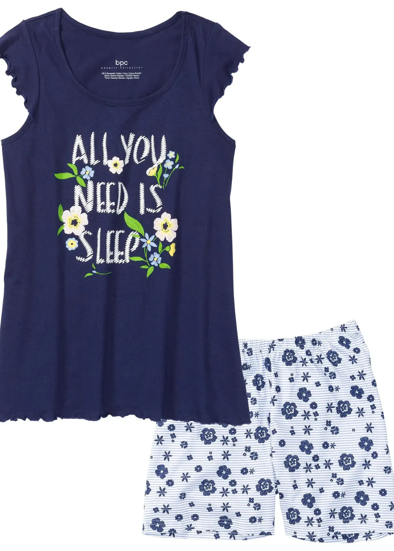 Pyjama doux comprenant un short imprimé et un T-shirt manches courtes et col rond. La forme trapèze évasée et les manches papillon du T-shirt apportent une touche féminine.