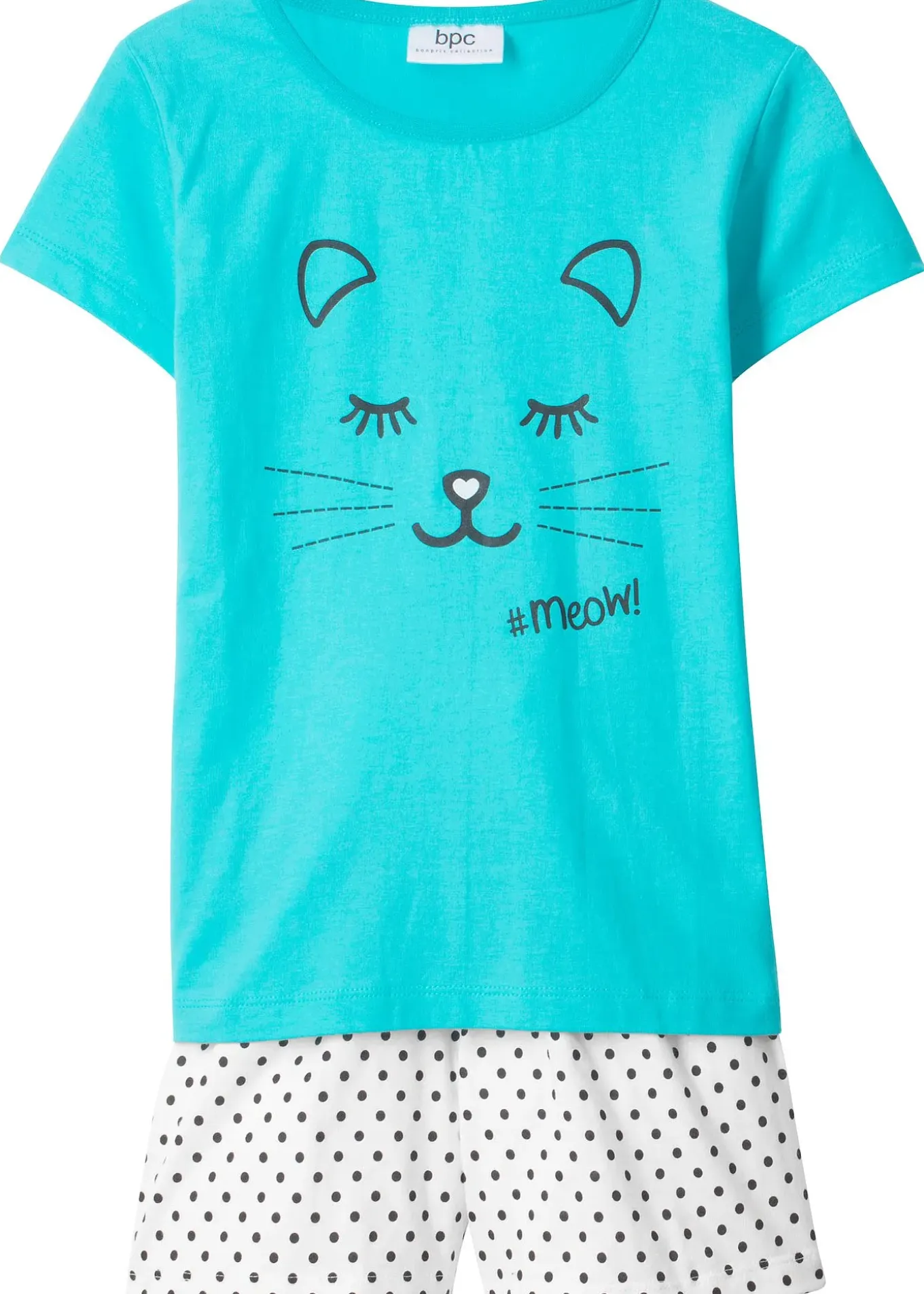 Pyjashort avec un motif animalier cool sur le devant du T-shirt. Le short est entièrement imprimé avec un motif de pois.