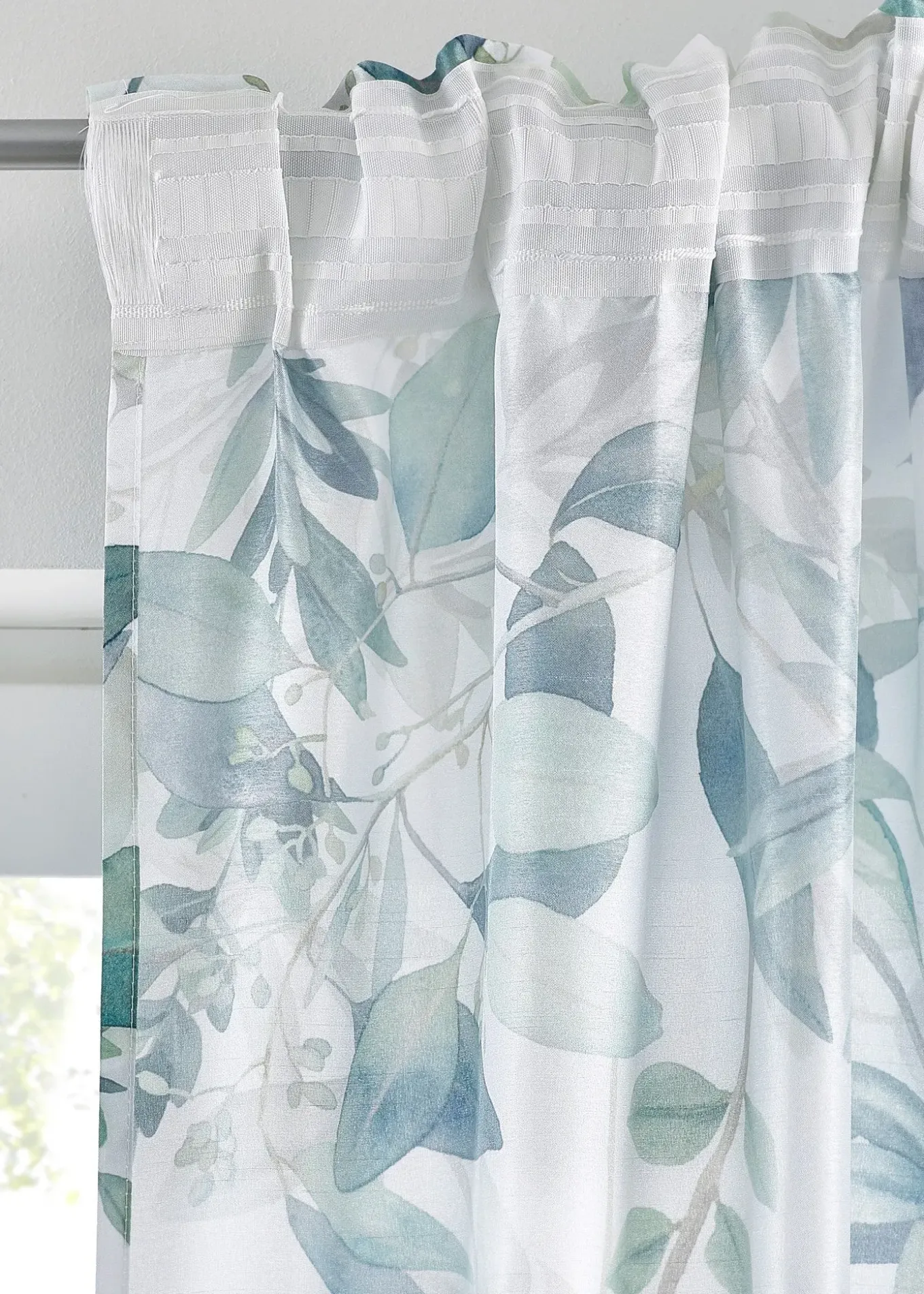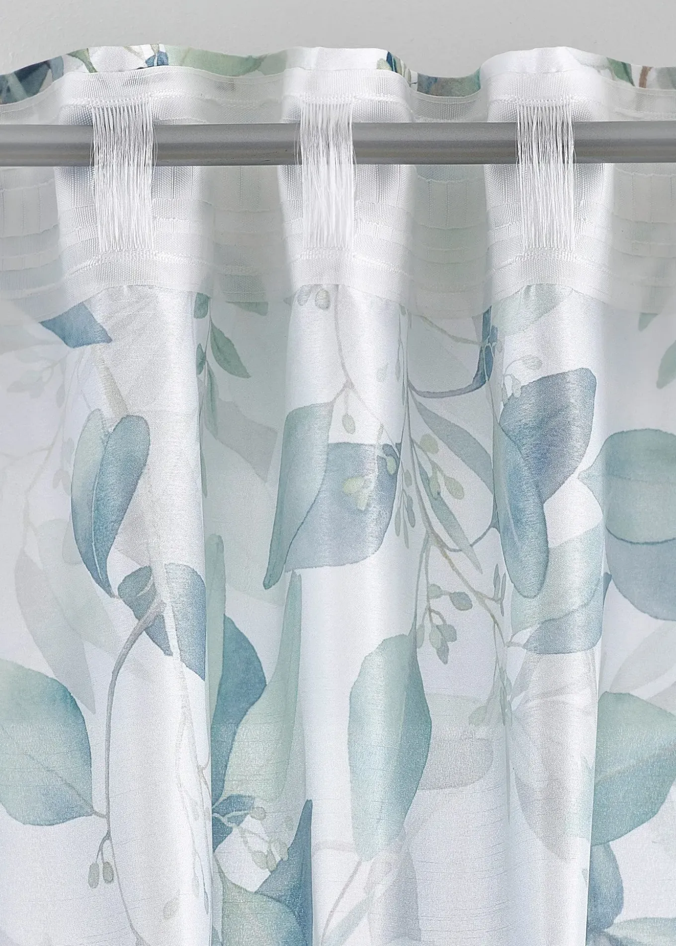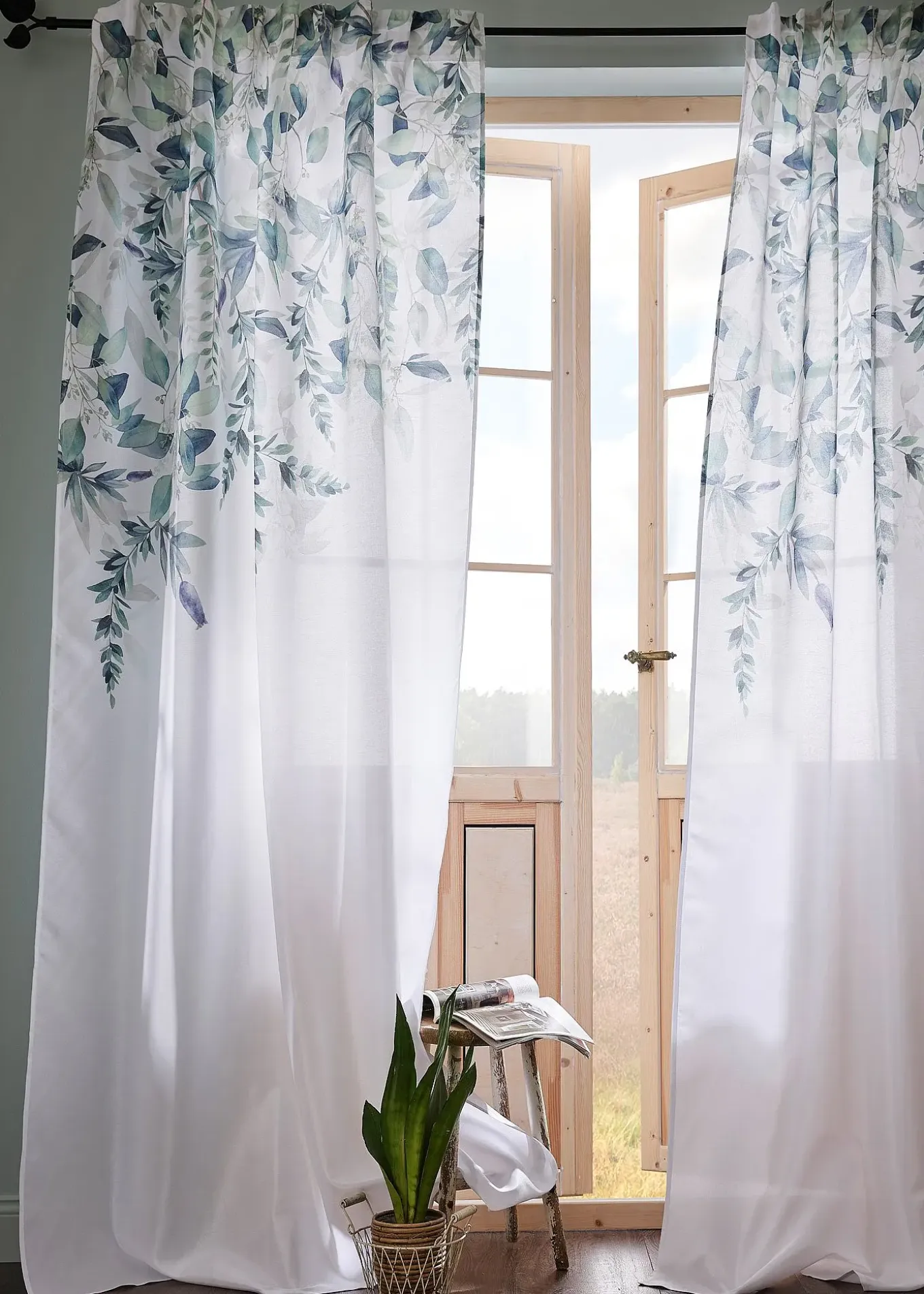 Rideau élégant avec un magnifique imprimé végétal du haut vers le bas. Belle matière effet soie, légèrement brillante pour illuminer votre fenêtre.