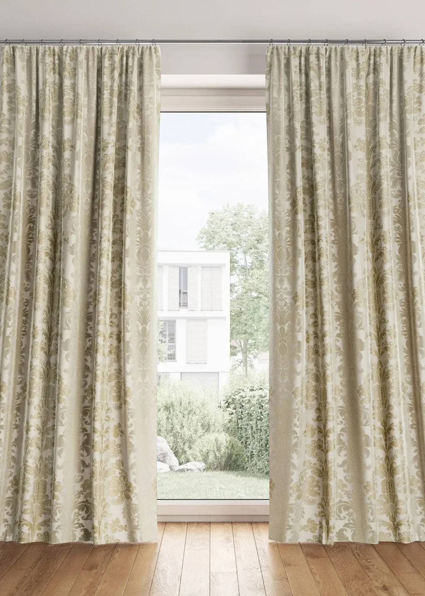 Rideau occultant permettant des économies d’énergie grâce à son tissu épais : bloque les rayons chauds du soleil ou les courants d’air froid.Motif ornemental raffiné sur le devant et le dos, car procédé jacquard de qualité. Double largeur (270 cm) travaillée avec une couture centrale.