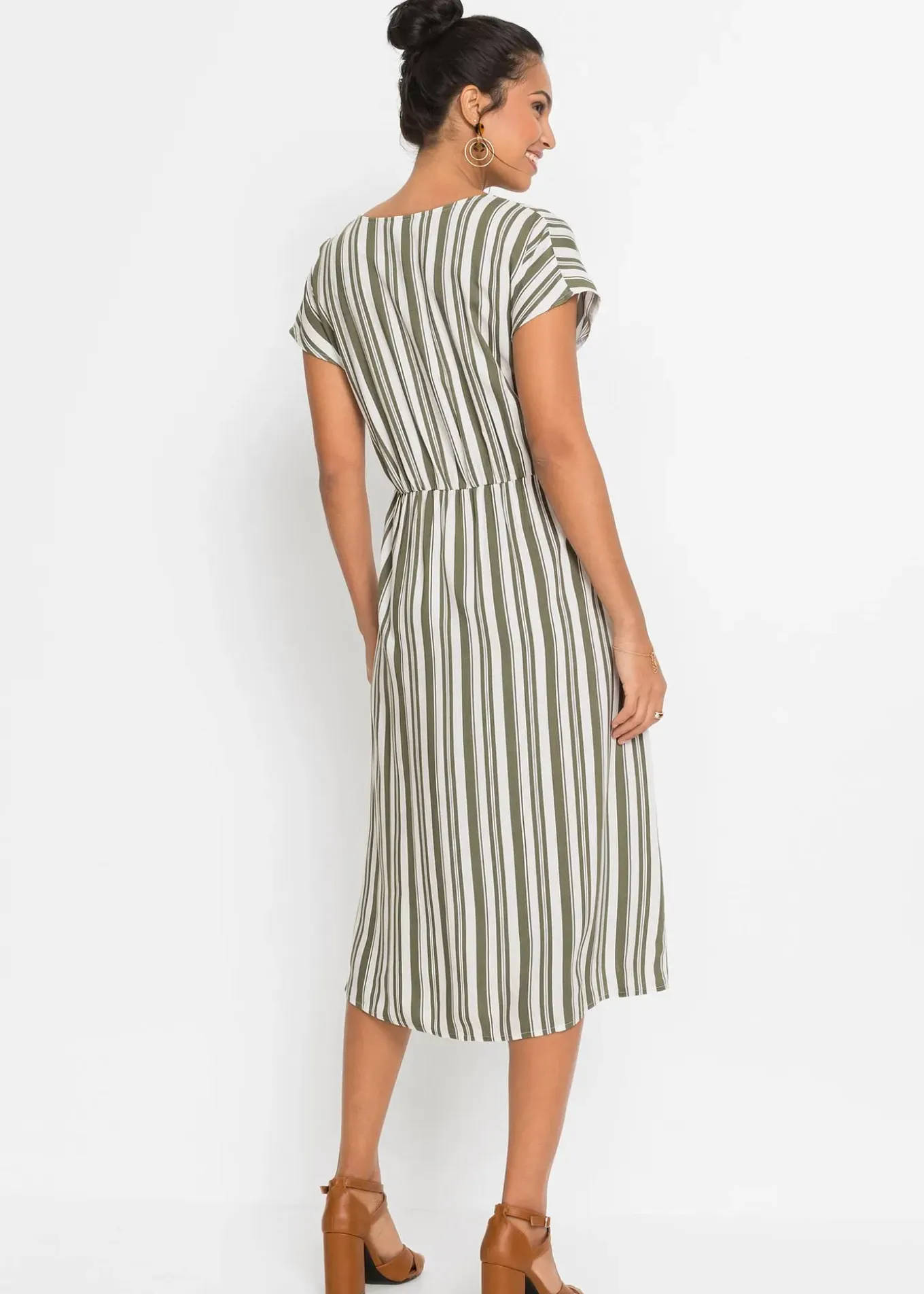 Robe estivale à joli imprimé rayures avec patte de boutonnage continue. Fronces au niveau de la poitrine et à la taille. Long. env. 114 cm.
