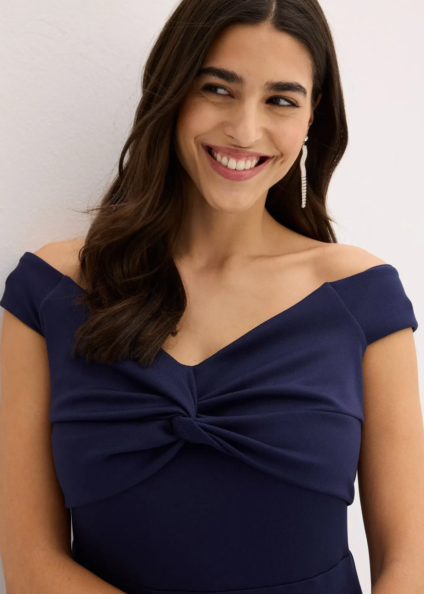 Robe féminine et tendance en matière néoprène solide avec col Bardot et détail nœud