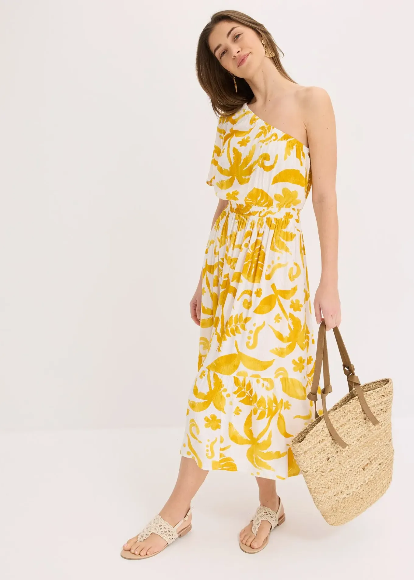 Robe midi asymétrique à imprimé floral, en viscose texturée, manche papillon ample et volant en bas de la jupe