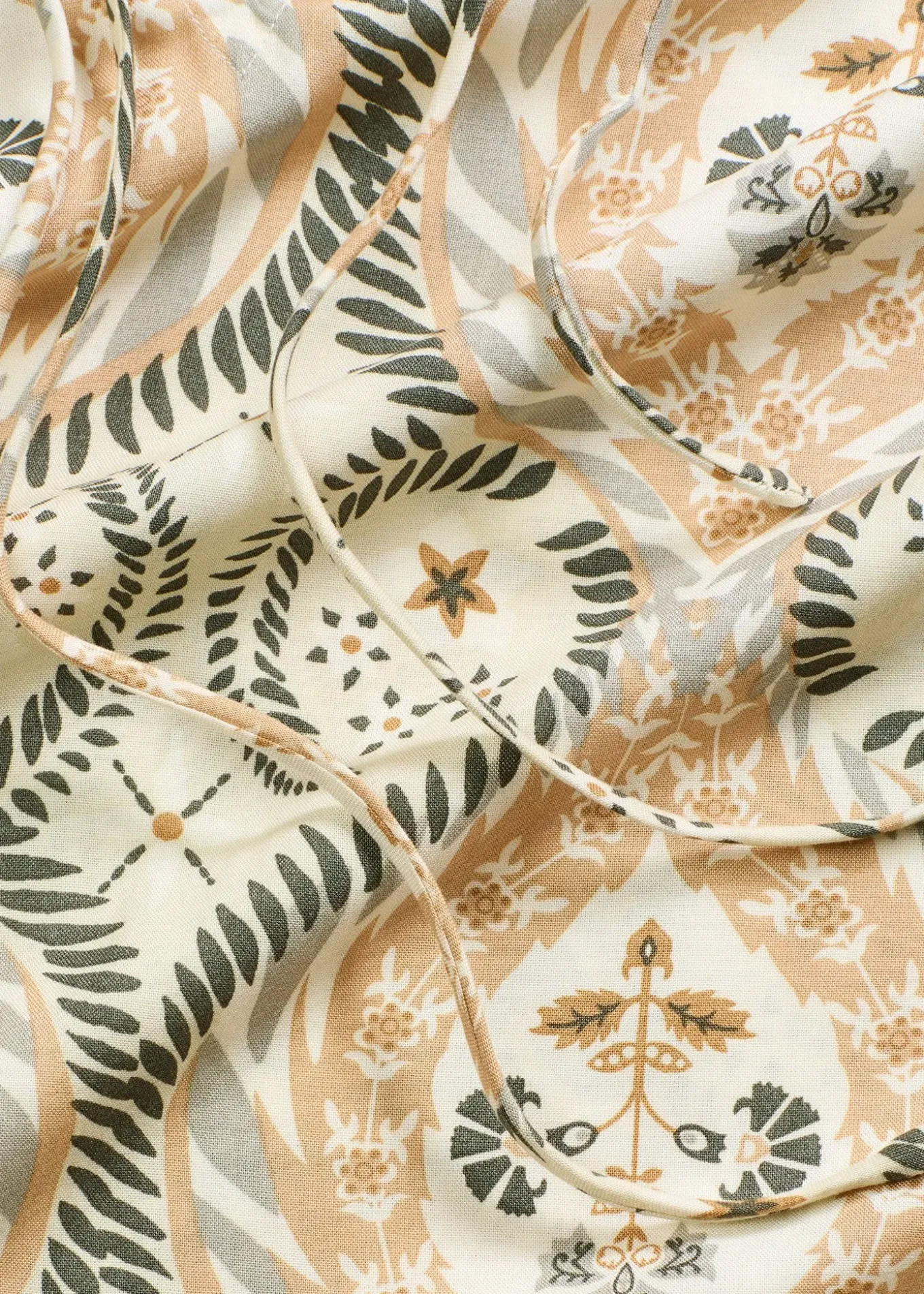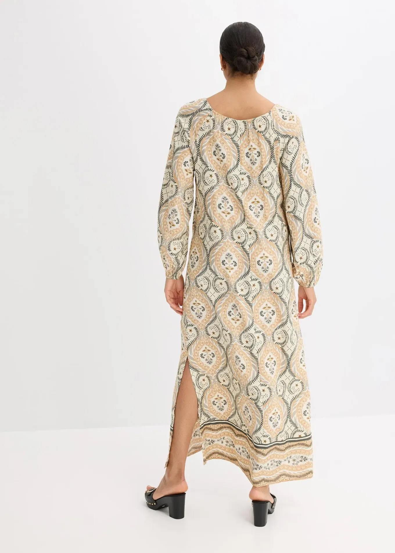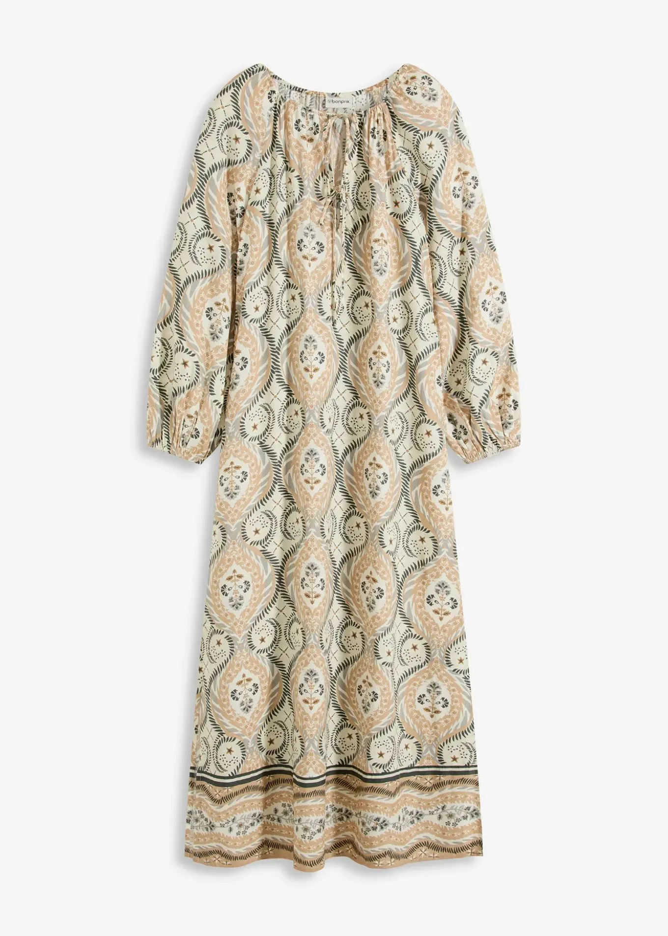 Longue robe caftan estivale en viscose fluide avec deux petits liens à nouer sur l’encolure devant
