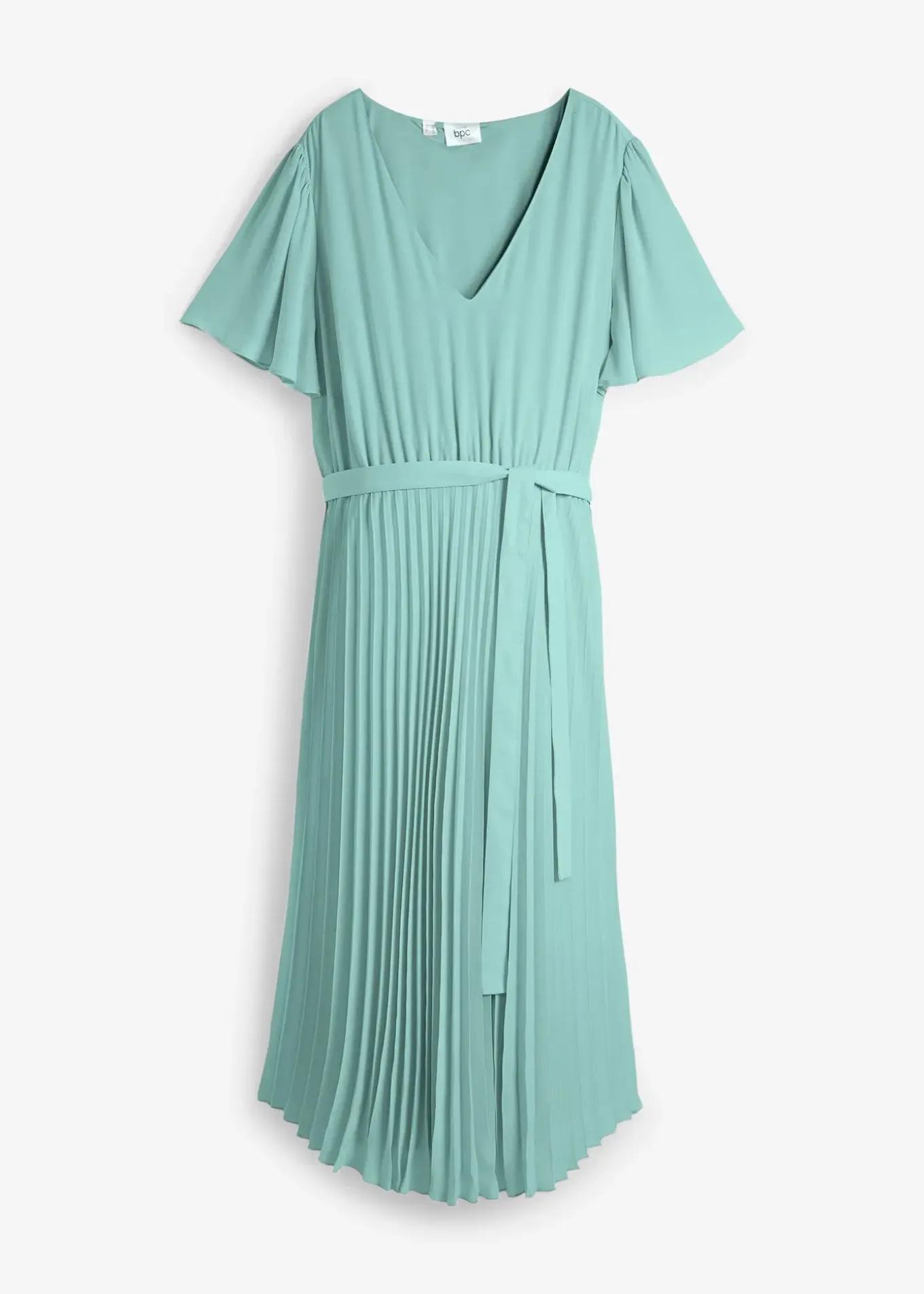 Robe midi légère en crêpe georgette à encolure V et manches papillon, doublée dans un coloris assorti pour un rendu opaque. Bande élastique sous poitrine pour une silhouette flatteuse. Jupe plissée et taille réglable par un lien amovible à nouer.
