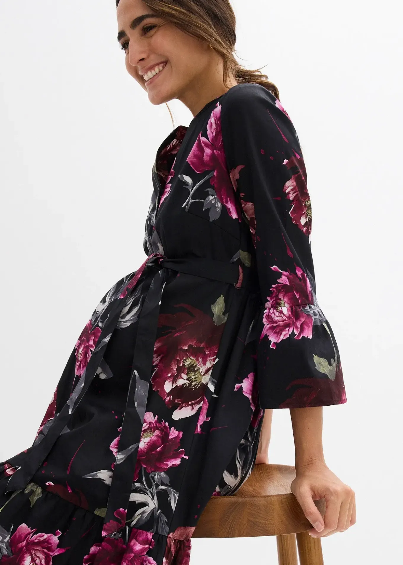 Robe fluide en coton doux et légèrement satiné. Grande encolure ronde et boutonnée pour faciliter l’allaitement avec petit col montant. Finitions volantées à la base et aux manches. Lien amovible à nouer à la taille pour une silhouette flatteuse.