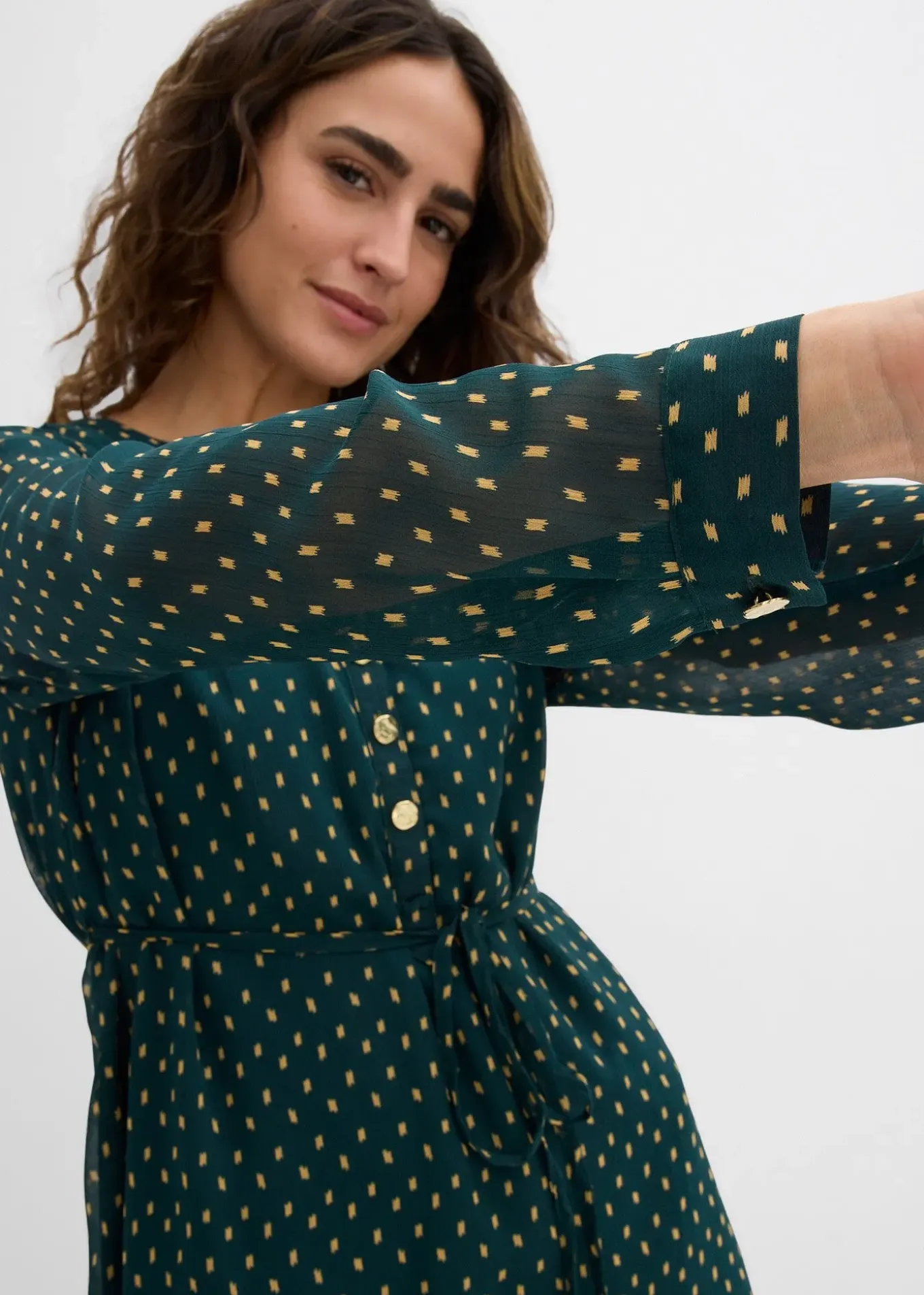 Robe en voile doublée avec manches longues semi-transparentes et col rond légèrement montant. Lien à nouer amovible pour souligner le ventre qui s’arrondit. Patte de boutonnage décorée de boutons dorés pour faciliter l’allaitement. Base légèrement arrondie. Manches avec manchette et bouton doré.