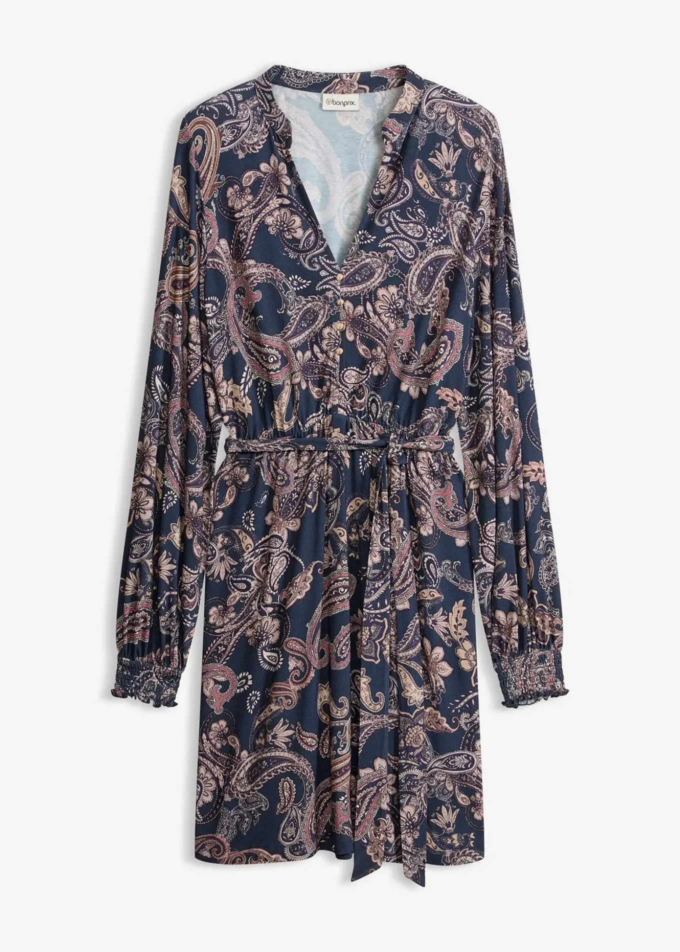 Robe féminine en jersey viscose doux avec lien à nouer à la taille et boutons décoratifs devant
