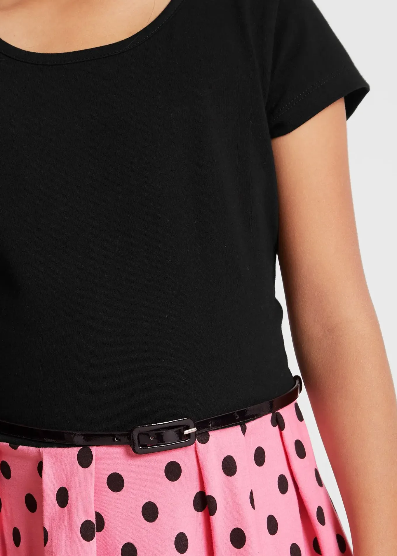 Adorable robe longueur genou flatteuse à manches courtes, couture d’empiècement élastiquée et jolie encolure ronde. Une fine ceinture complète la tenue à merveille.