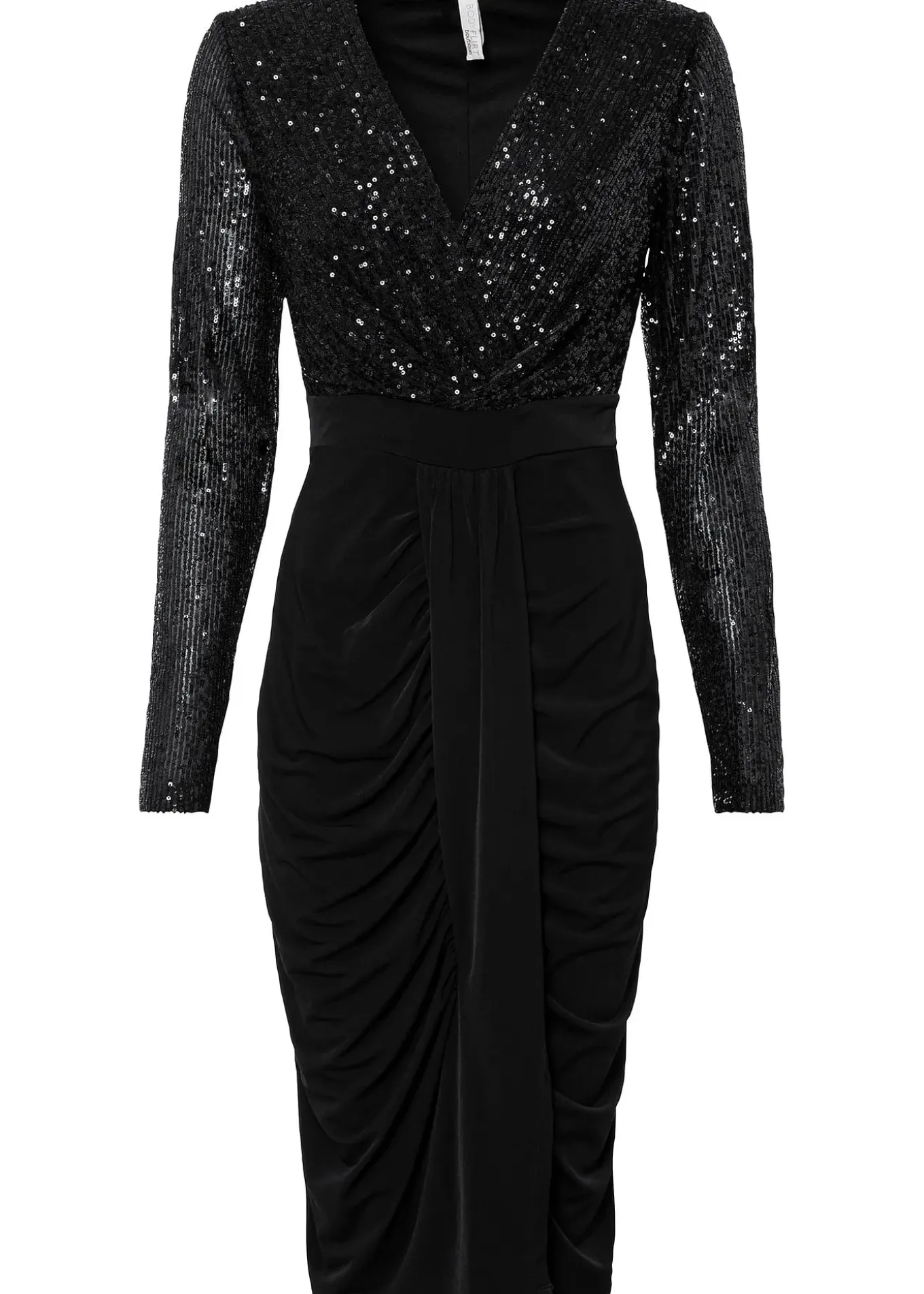 Robe féminine et festive à sequins avec fronces et drapé sur la jupe