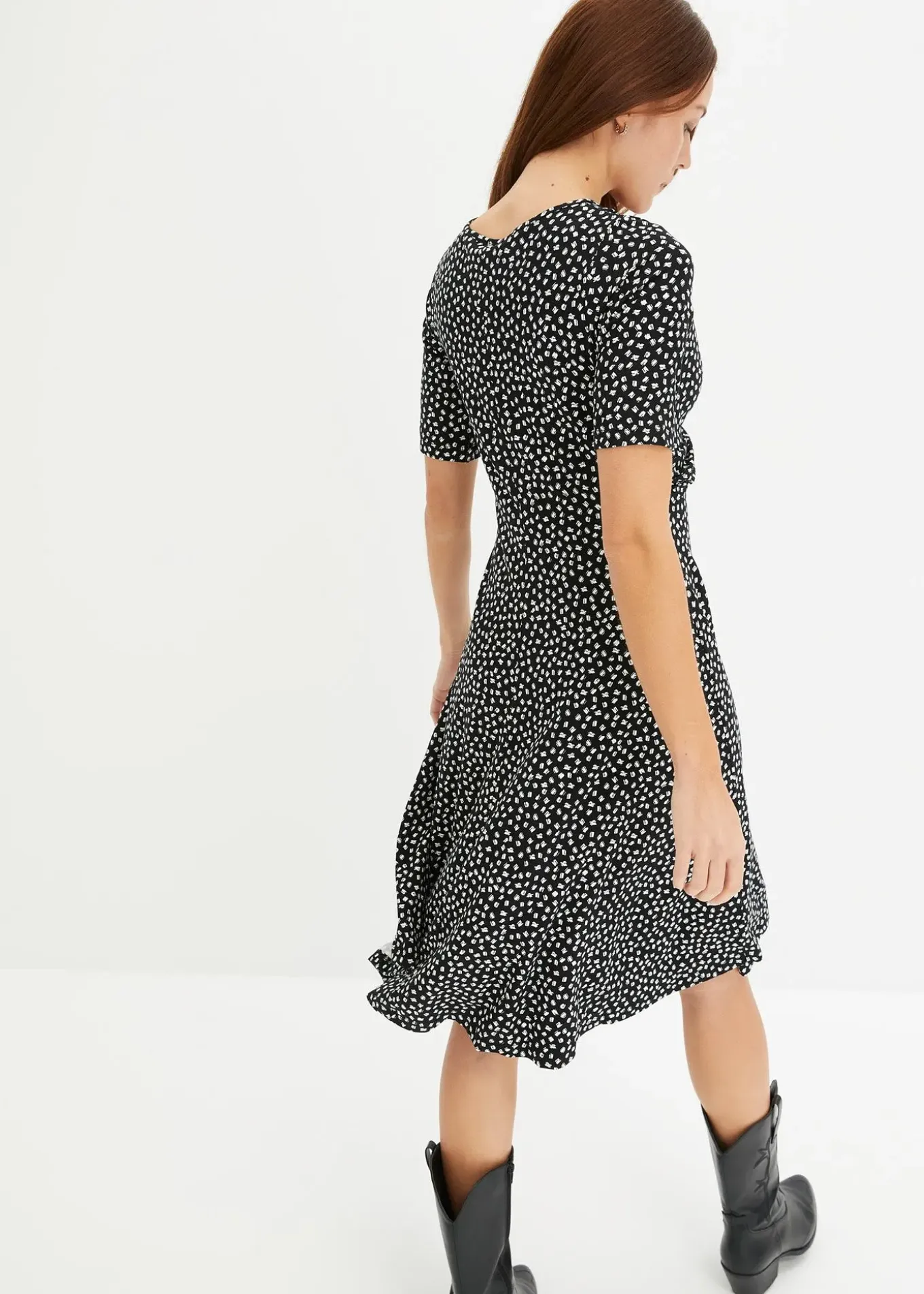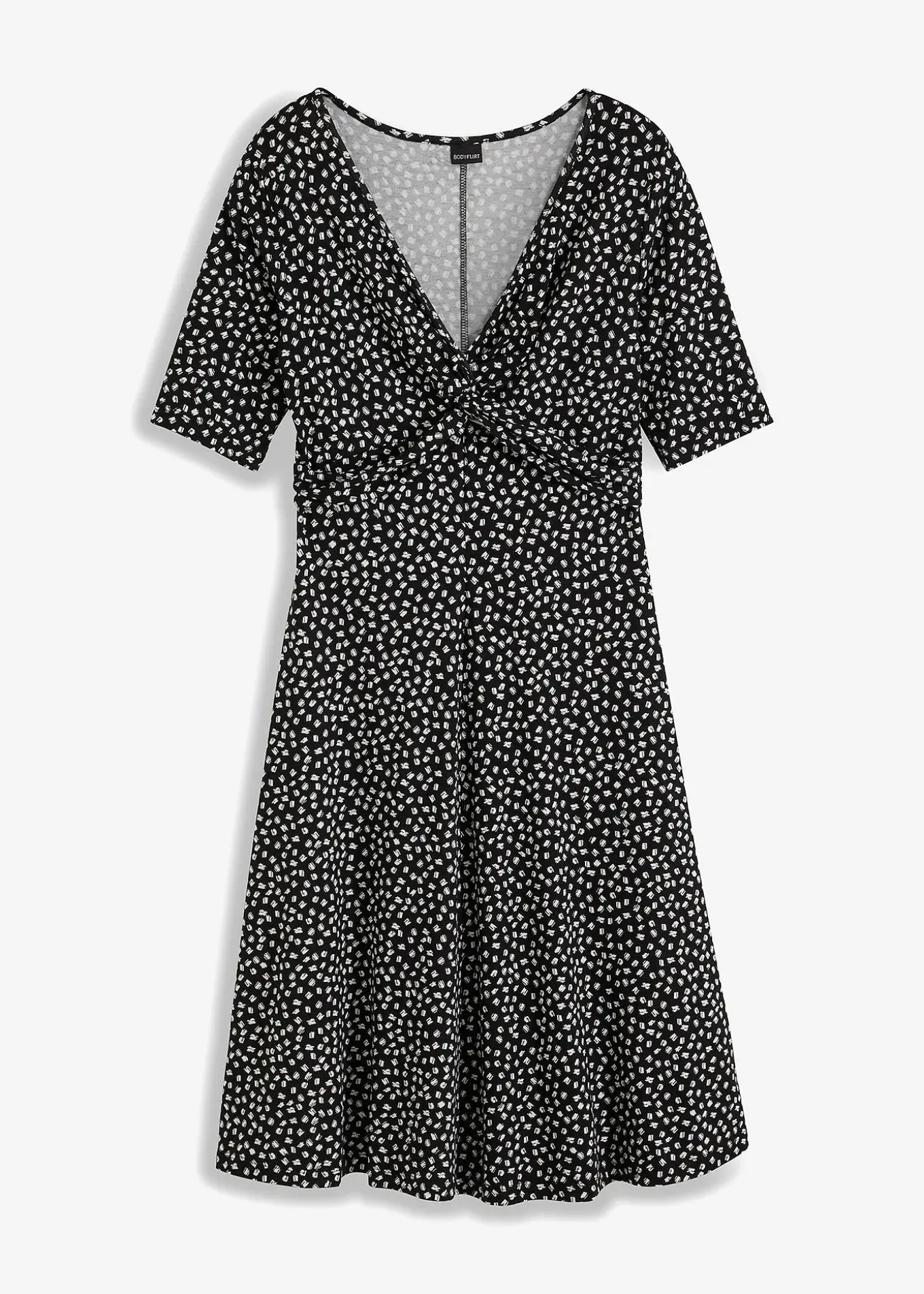 Robe en jersey entièrement imprimée de BODYFLIRT pour un look accrocheur. Cette robe longueur genou se distingue par des fronces sous la poitrine, un décolleté en V profond à effet drapé et des manches coude étroites. Pour un look chic, on la porte avec des escarpins ou des sandales à talon. Pour un look tendance, on l’associe avec des ballerines ou des mocassins, une veste en jean et un sac original.