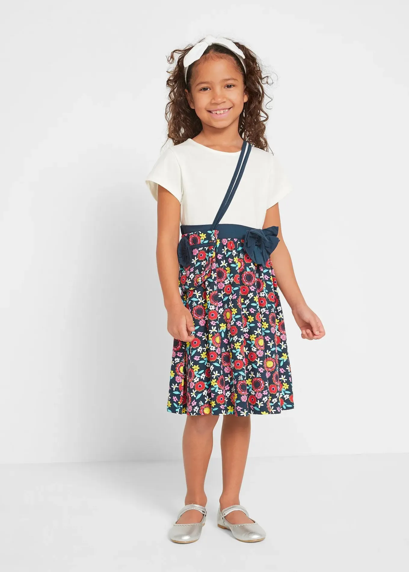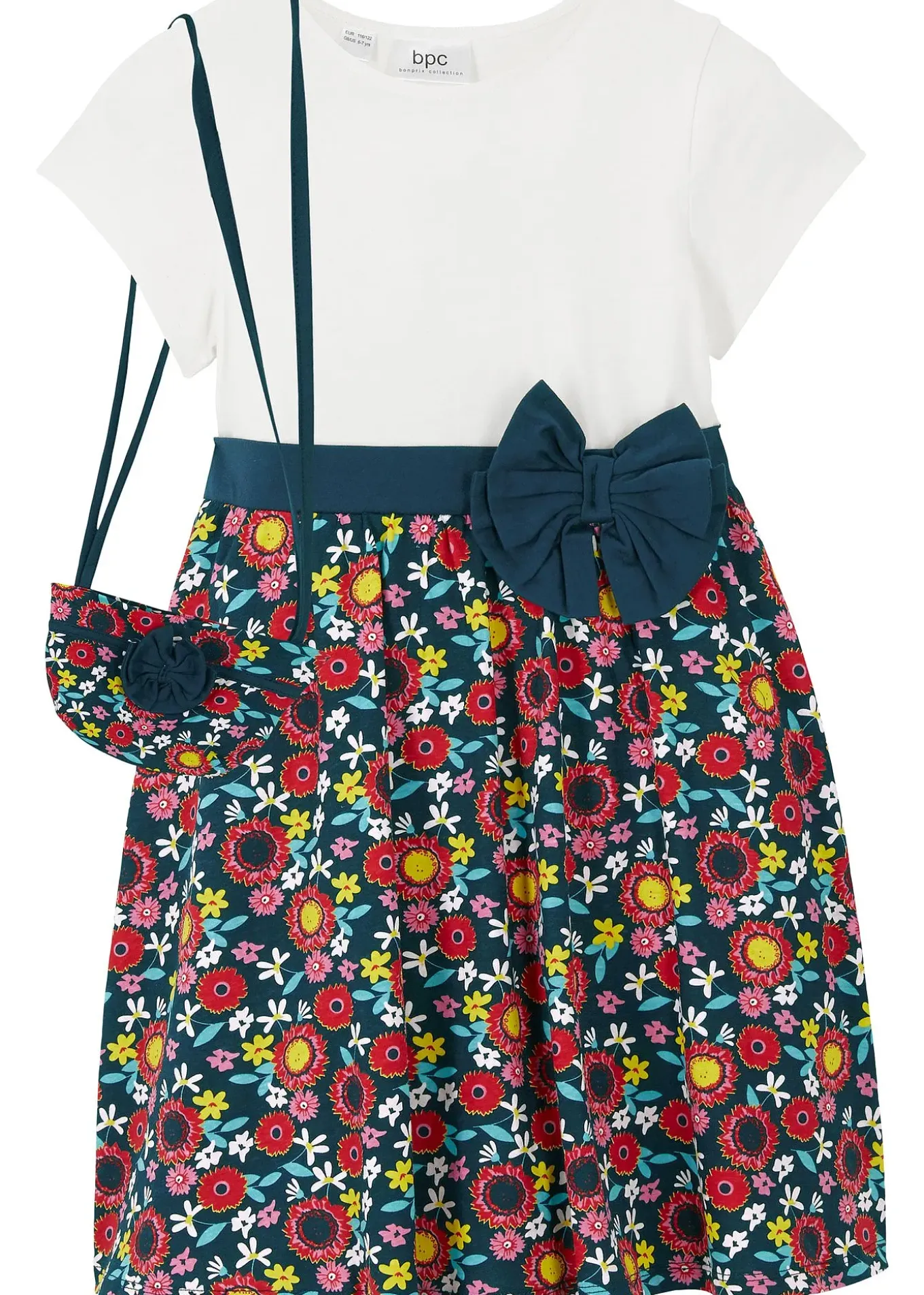 Jolie robe avec empiècement jupe coloré à imprimé floral et petit sac à bandoulière assorti. Manches courtes, longueur genou.
