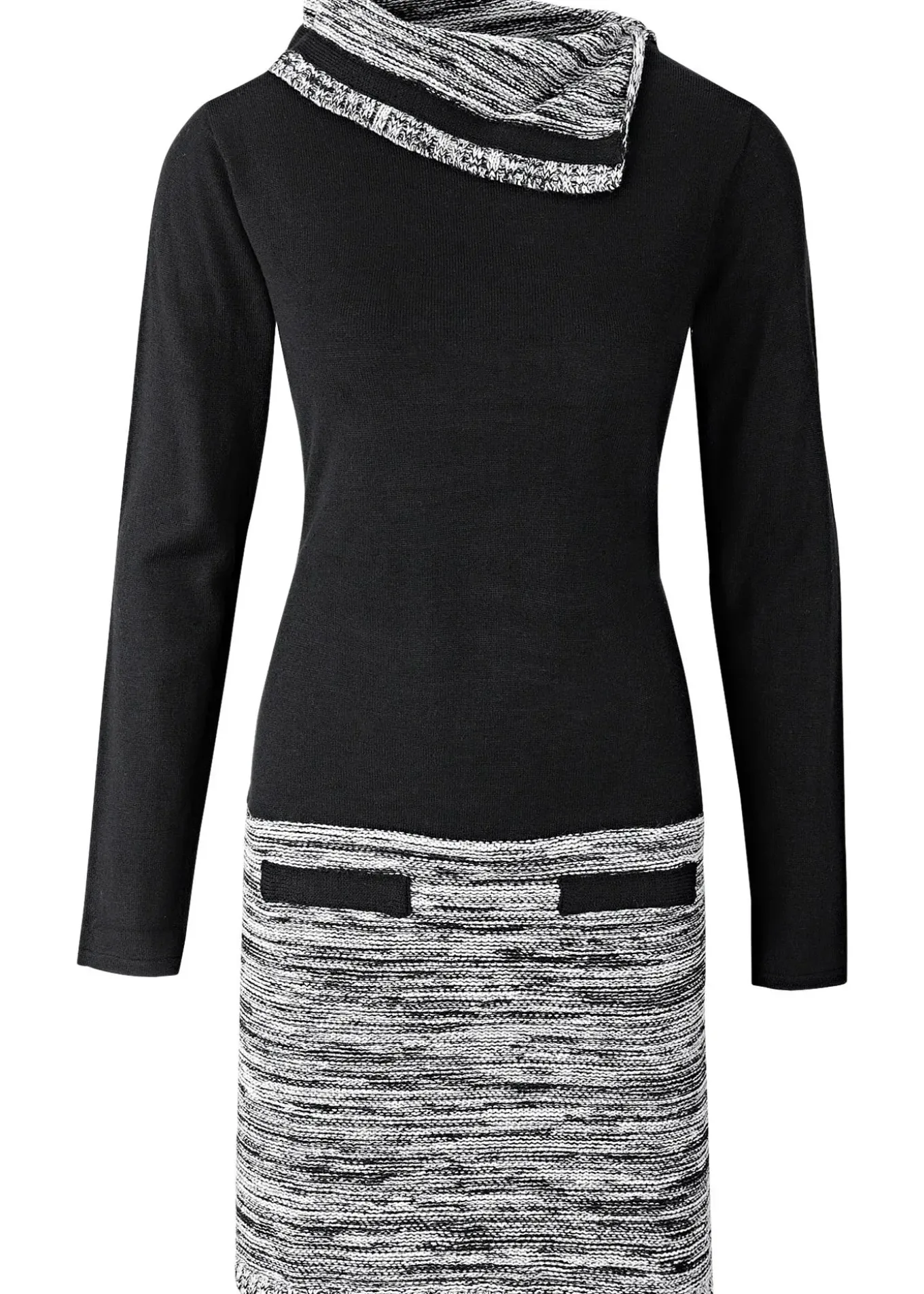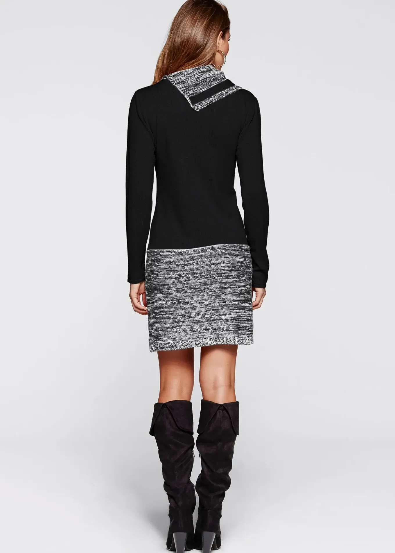 Jolie robe en maille bicolore, effet ensemble coordonné. Jupe chinée, haut simple. Col roulé chiné, très tendance. On la porte avec des cuissardes ou des bottes pour un look féminin.