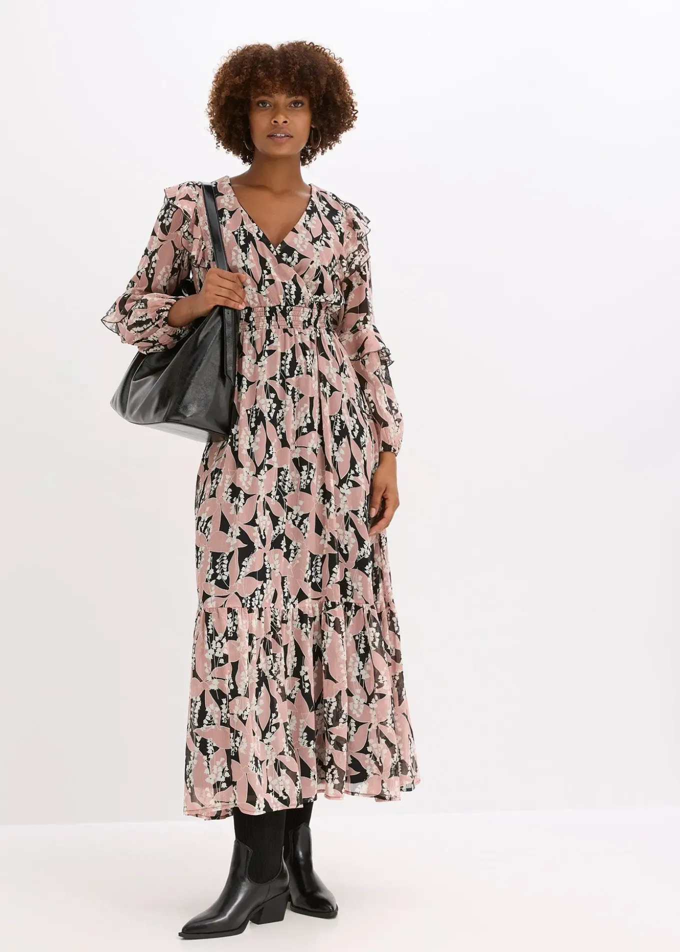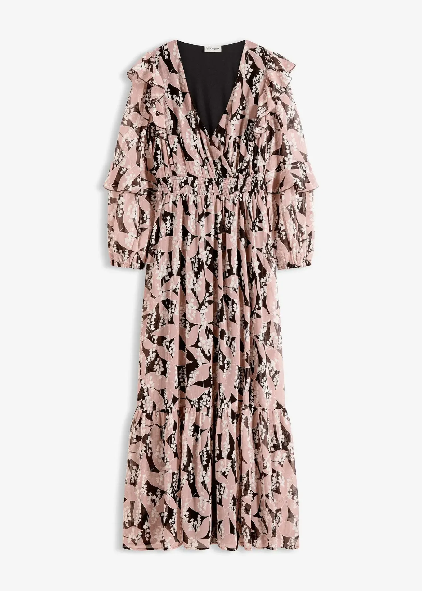 Robe longue en mousseline imprimée avec de jolis volants sur les épaules et les manches amples