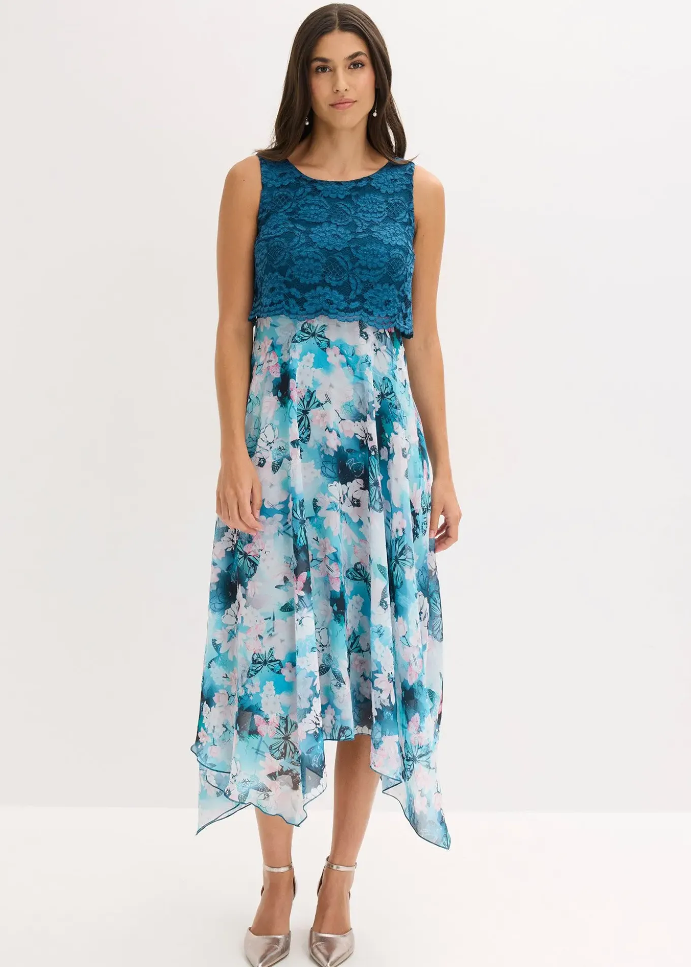 Robe midi élégante à pans en fine mousseline avec dentelle sur le haut