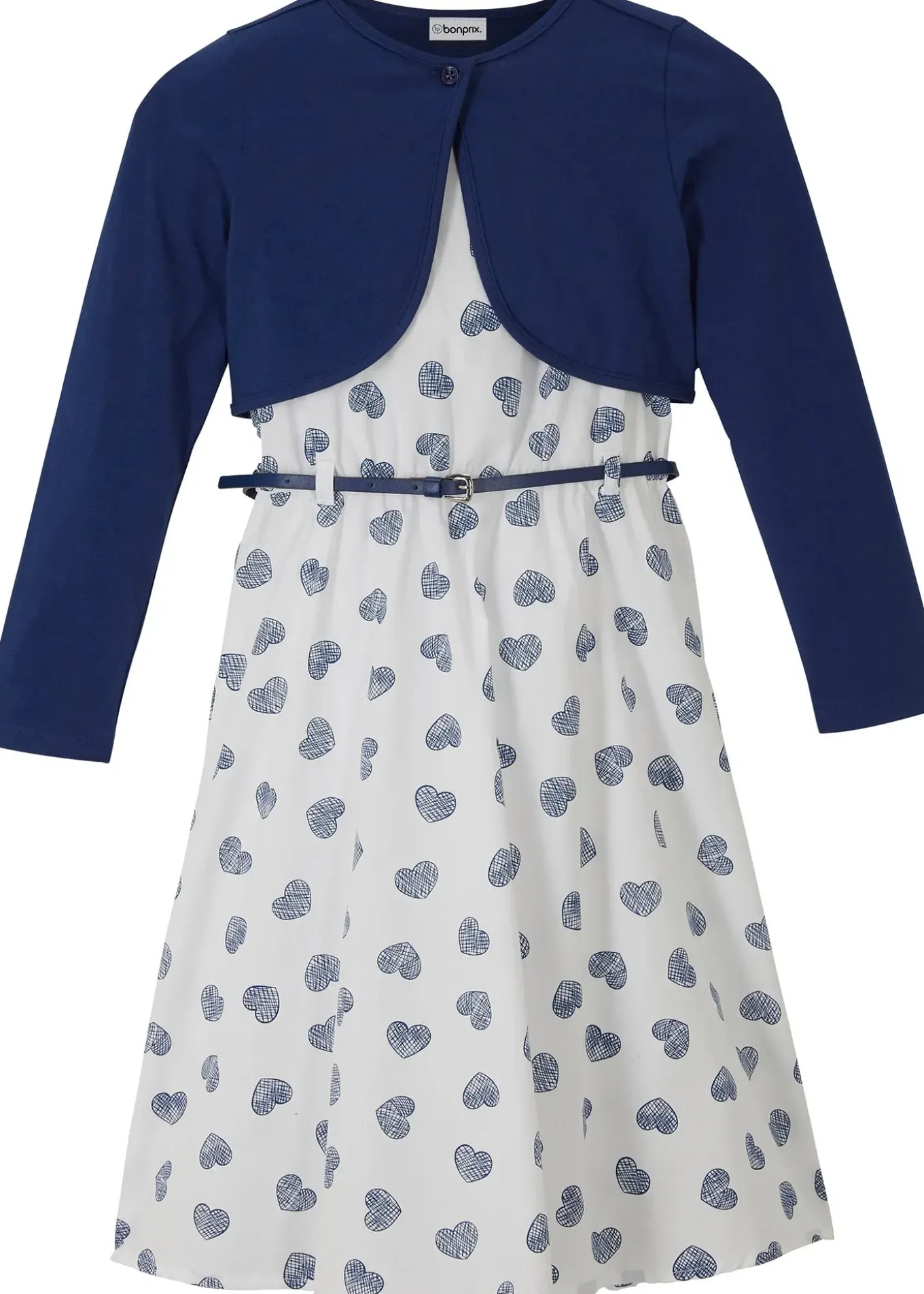 Joli ensemble comprenant une robe, un boléro et une ceinture. Imprimé petits cœurs sur la robe.