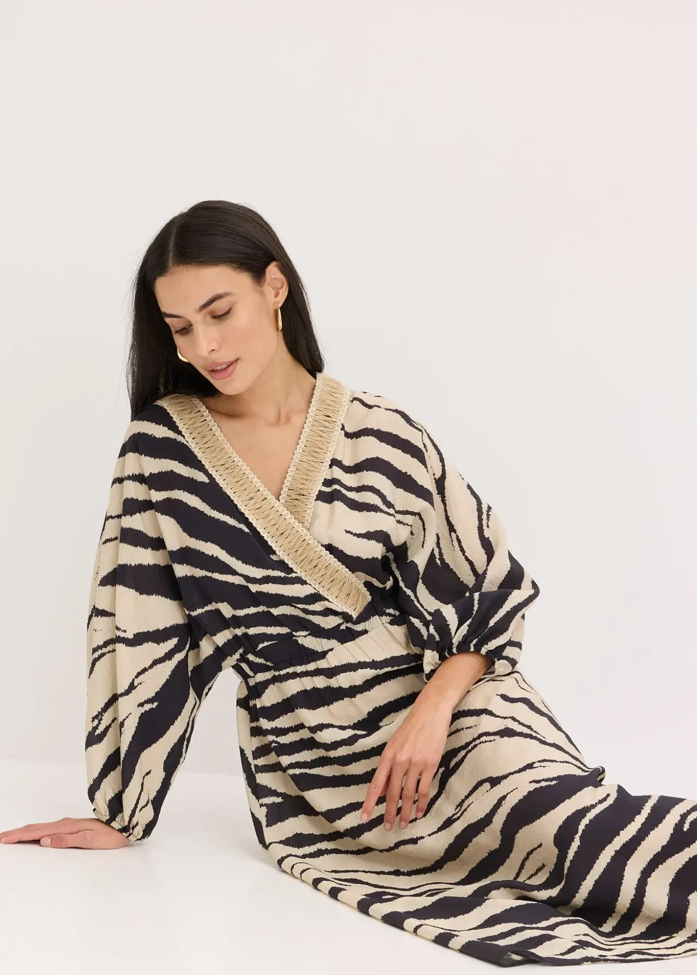 Robe midi imprimée à la mode en viscose mélangée fluide avec application décorative le long de l’encolure sur le devant