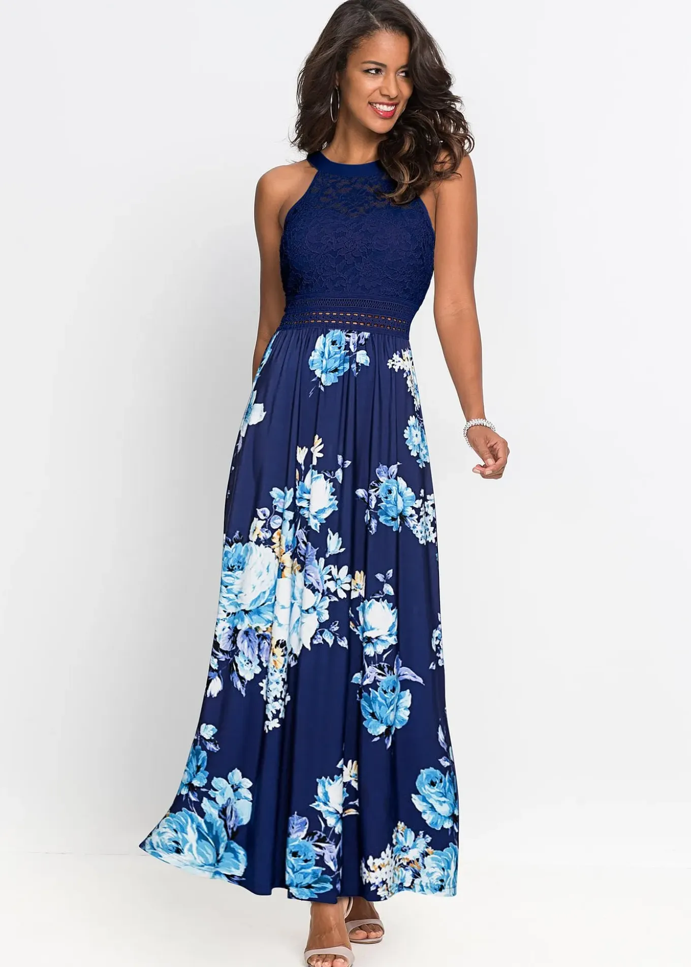 Robe d’été romantique de BODYFLIRT avec imprimé floral et dentelle. Jupe longue et ample et haut en dentelle à encolure américaine qui souligne la silhouette.