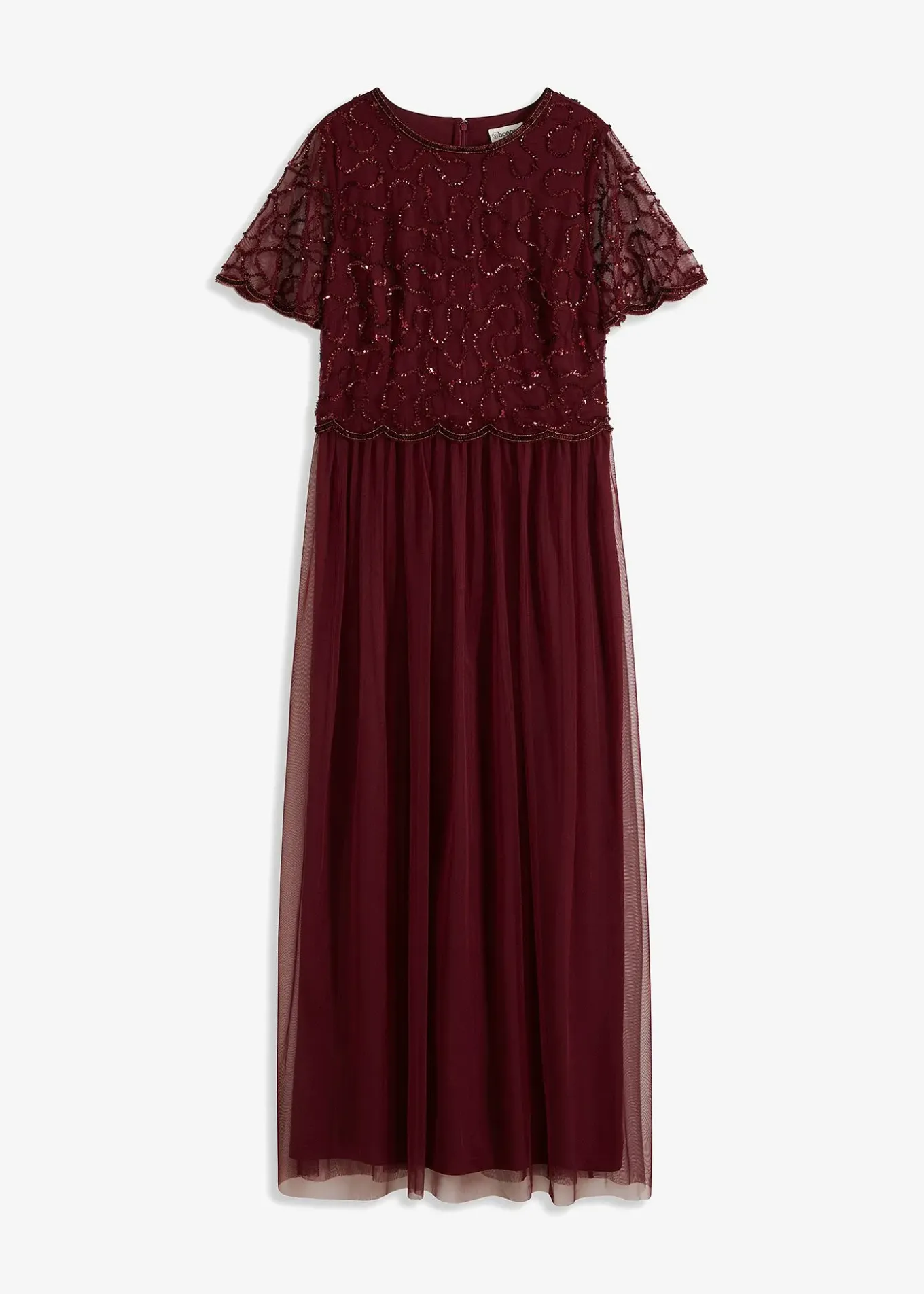 Robe de soirée élégante et féminine en tulle avec sequins brodés sur le haut. Bord festonné sur le haut et les manches pour un style élégant.