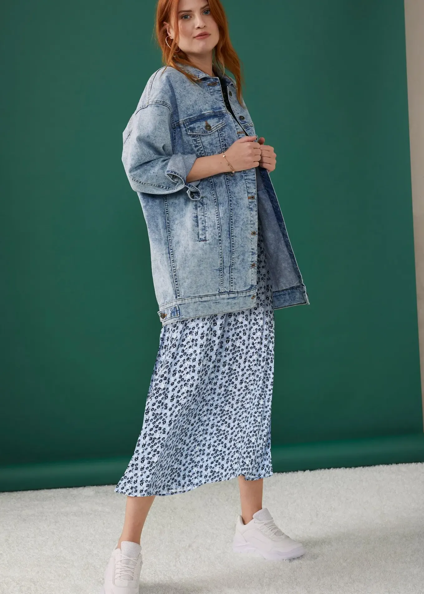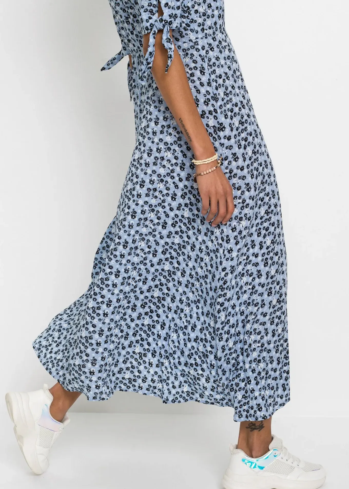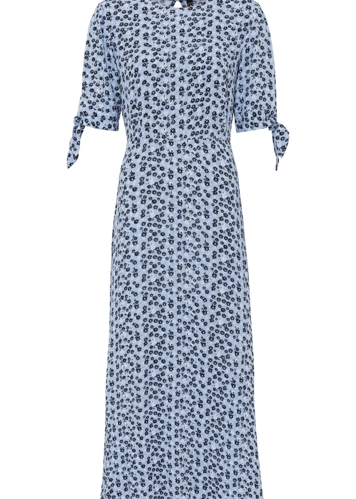 Joli imprimé fleuri et détail nœud en bas de manches. Long. env. 126 cm.