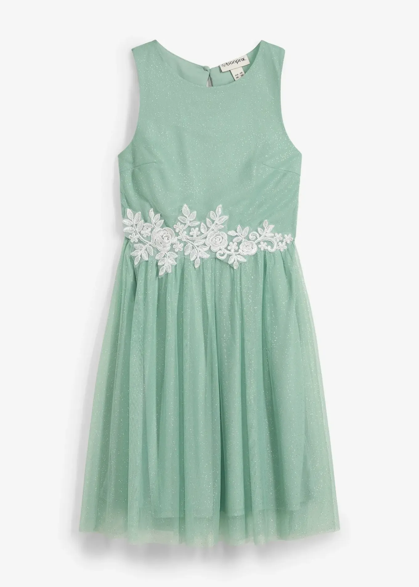 Robe sans manches avec une belle dentelle appliquée à la taille. Jupe légèrement brillante.