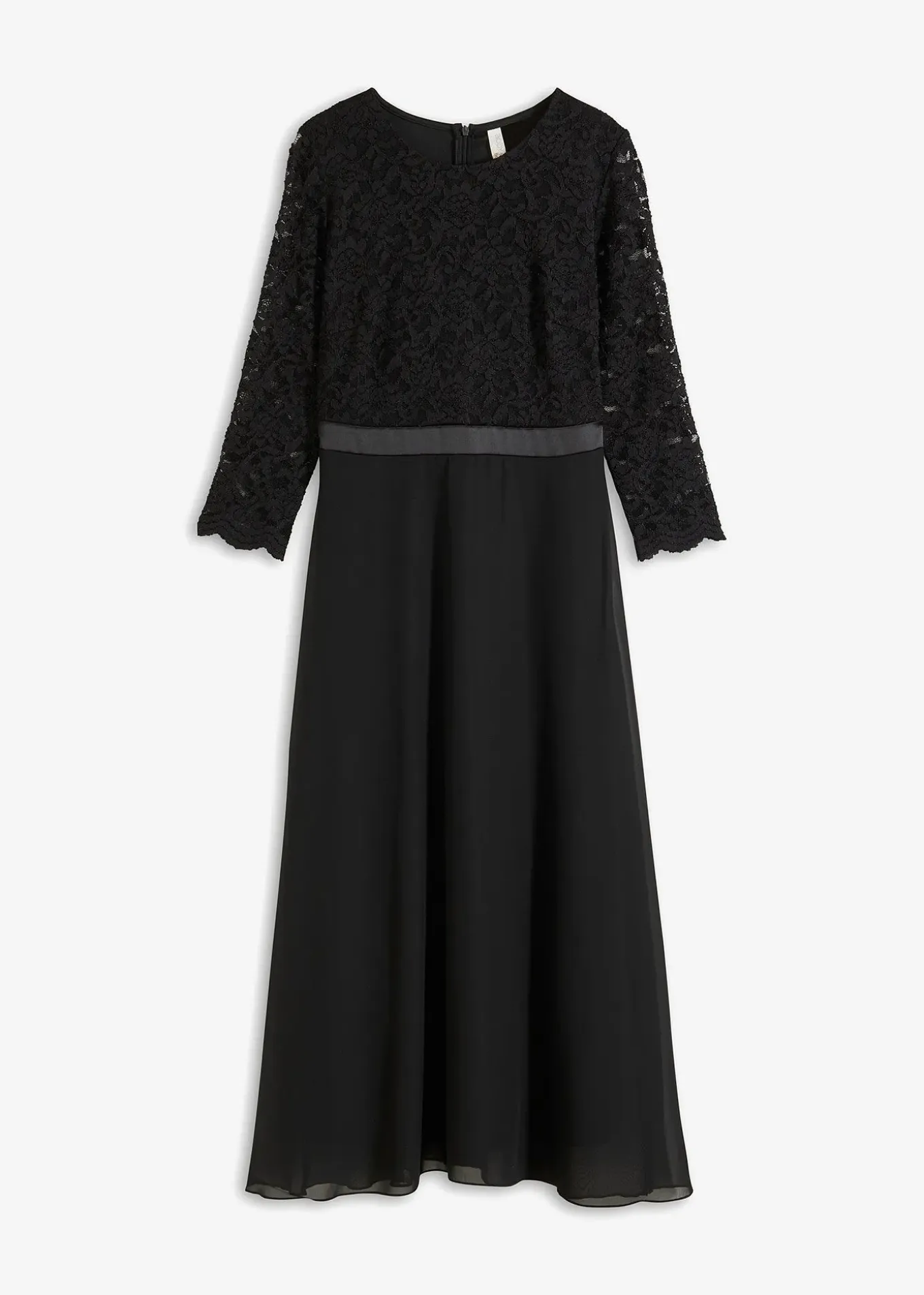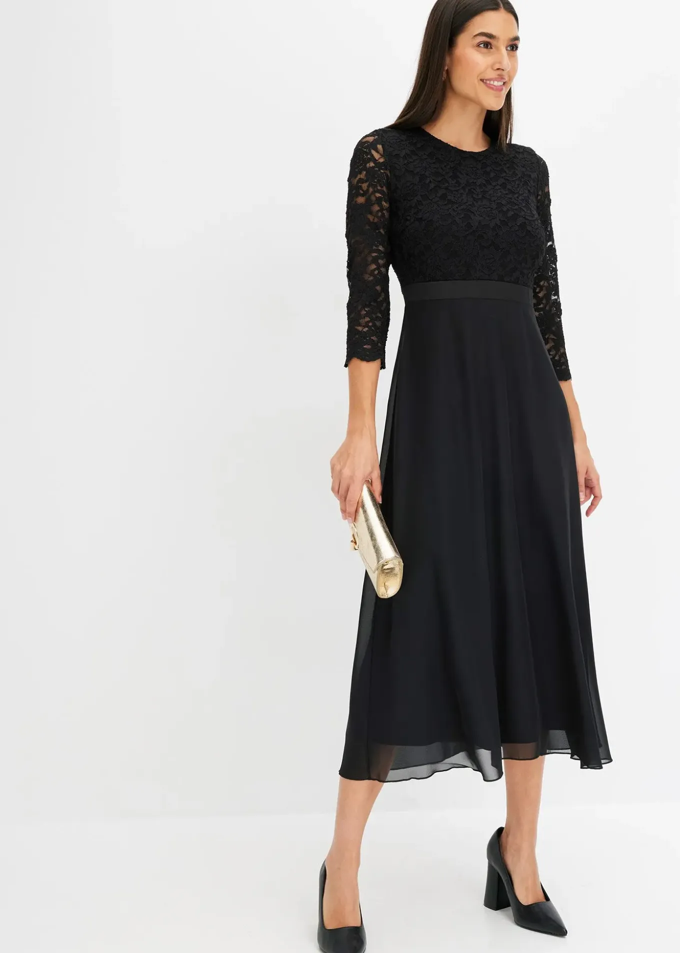 Robe midi romantique et féminine, forme trapèze, en mousseline légère avec doublure et dentelle sur le haut