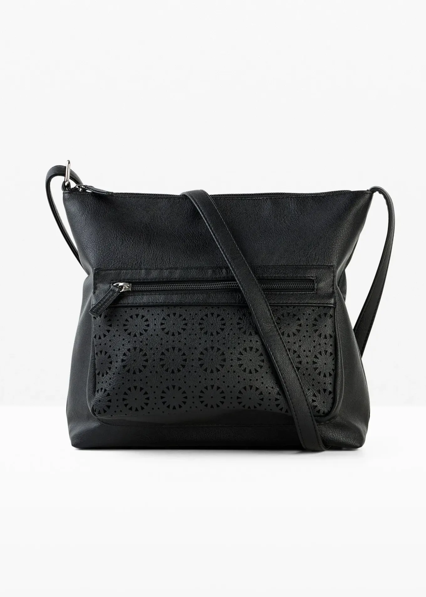 Joli sac à bandoulière avec petites perforations sur le devant. Deux compartiments extérieurs zippés pour un rangement supplémentaire.