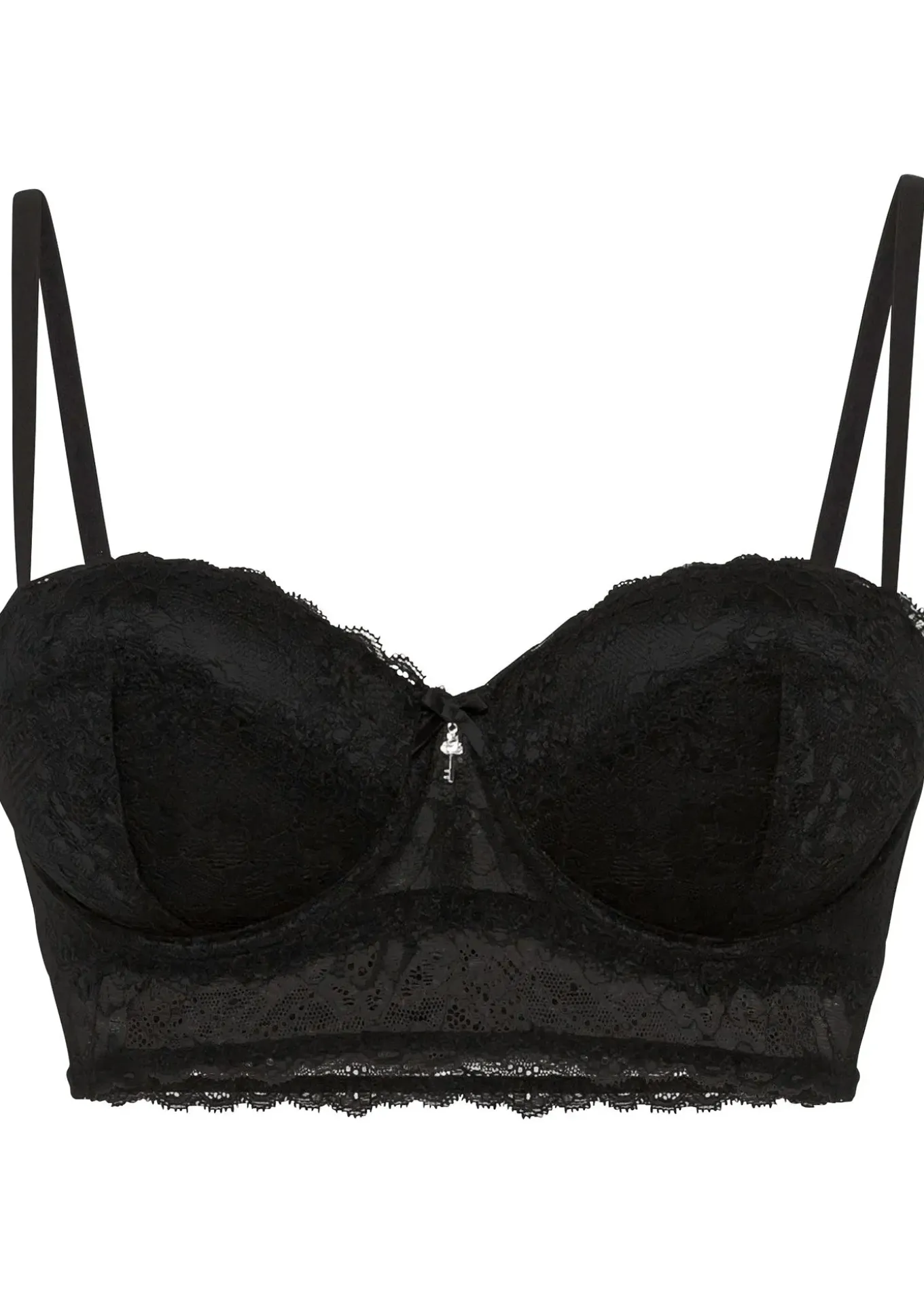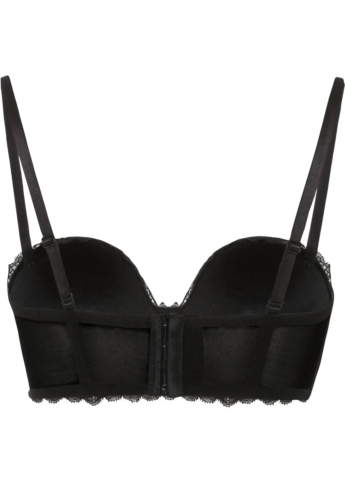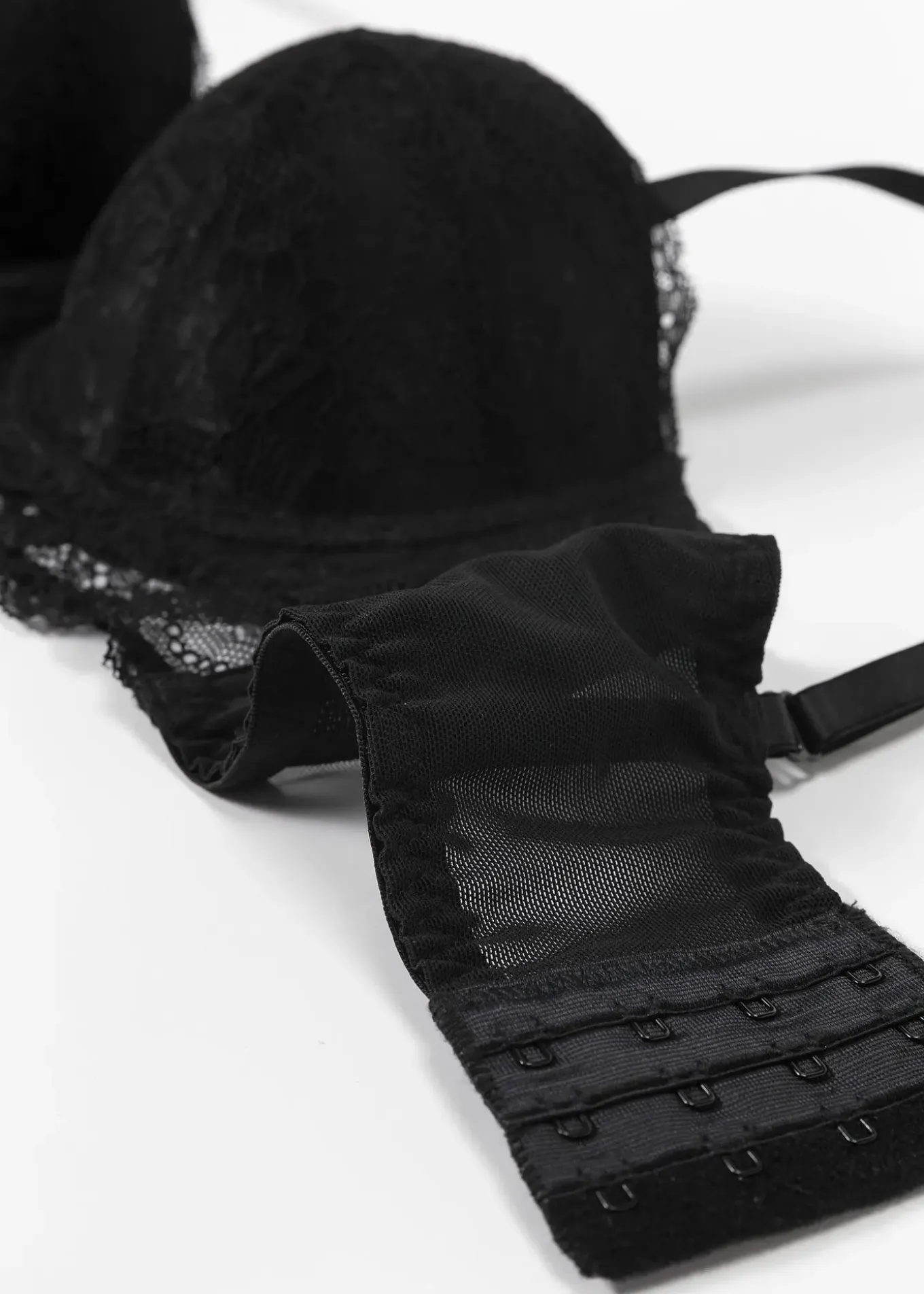 Soutien-gorge balconnet bicolore tendance avec dentelle. Bande sous poitrine superposée, bonnets rembourrés moulés sans coutures avec armatures, bretelles et fermeture à agrafe réglables individuellement et plus larges pour les bonnets plus grands. Nœud décoratif avec pendentif brillant.
