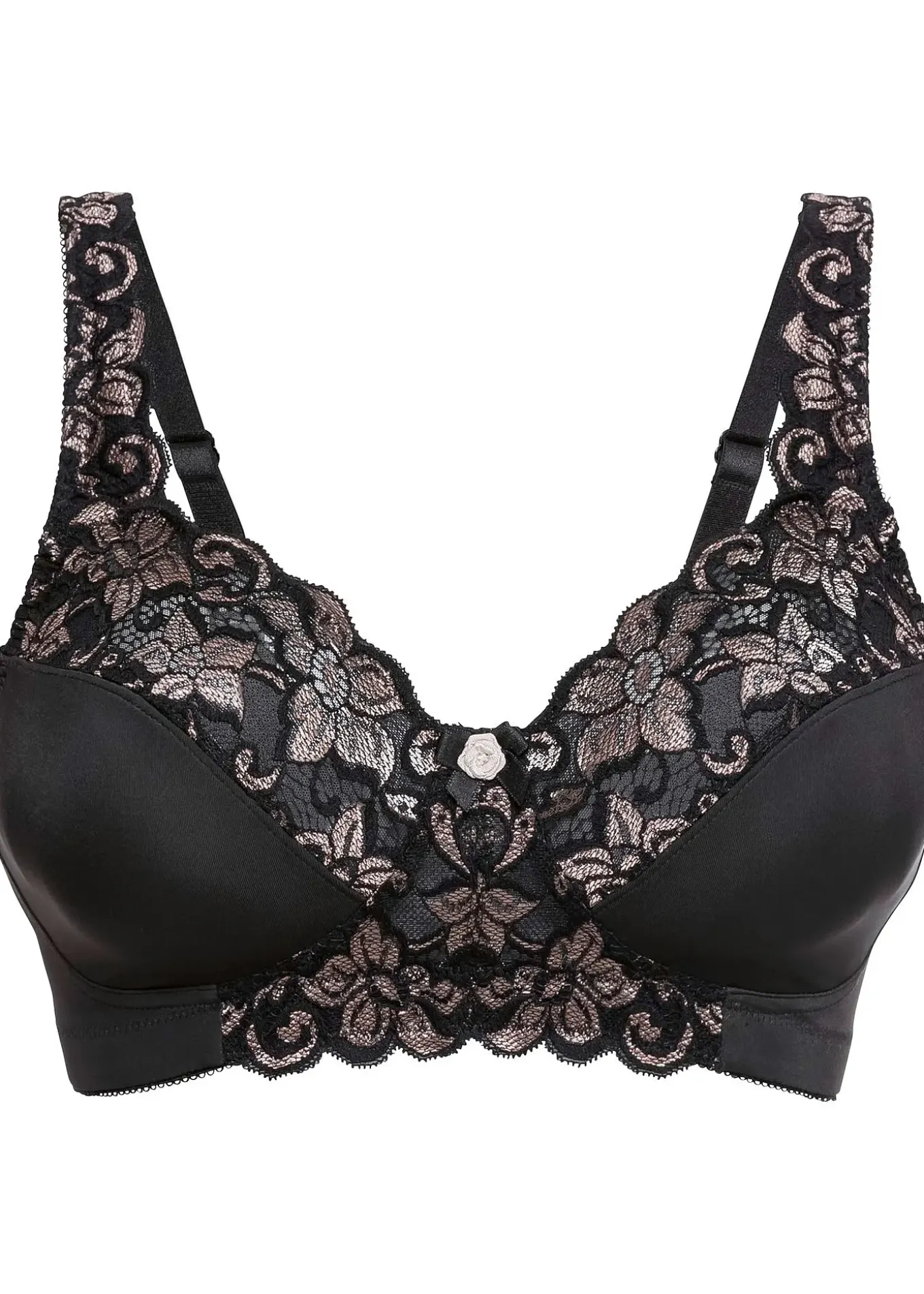 Soutien-gorge minimiseur sans armatures à la fois fonctionnel, confortable et élégant. Coupe spéciale pour fait paraître la poitrine plus petite et bretelles rembourrées et plus larges pour plus de confort et soulager les épaules. Dentelle contrastée et petit nœud décoratif avec une rose. S’accorde avec le maxi slip assorti. Maite Kelly recommande : « C’est la sensualité à l’état pur. Idéal pour rencontrer l’homme de ses rêves. Quand il est important de se sentir féminine et charmante. Un ensemble qui a une coupe parfaite et qui met en valeur les charmes féminins. Qui peut y résister? »