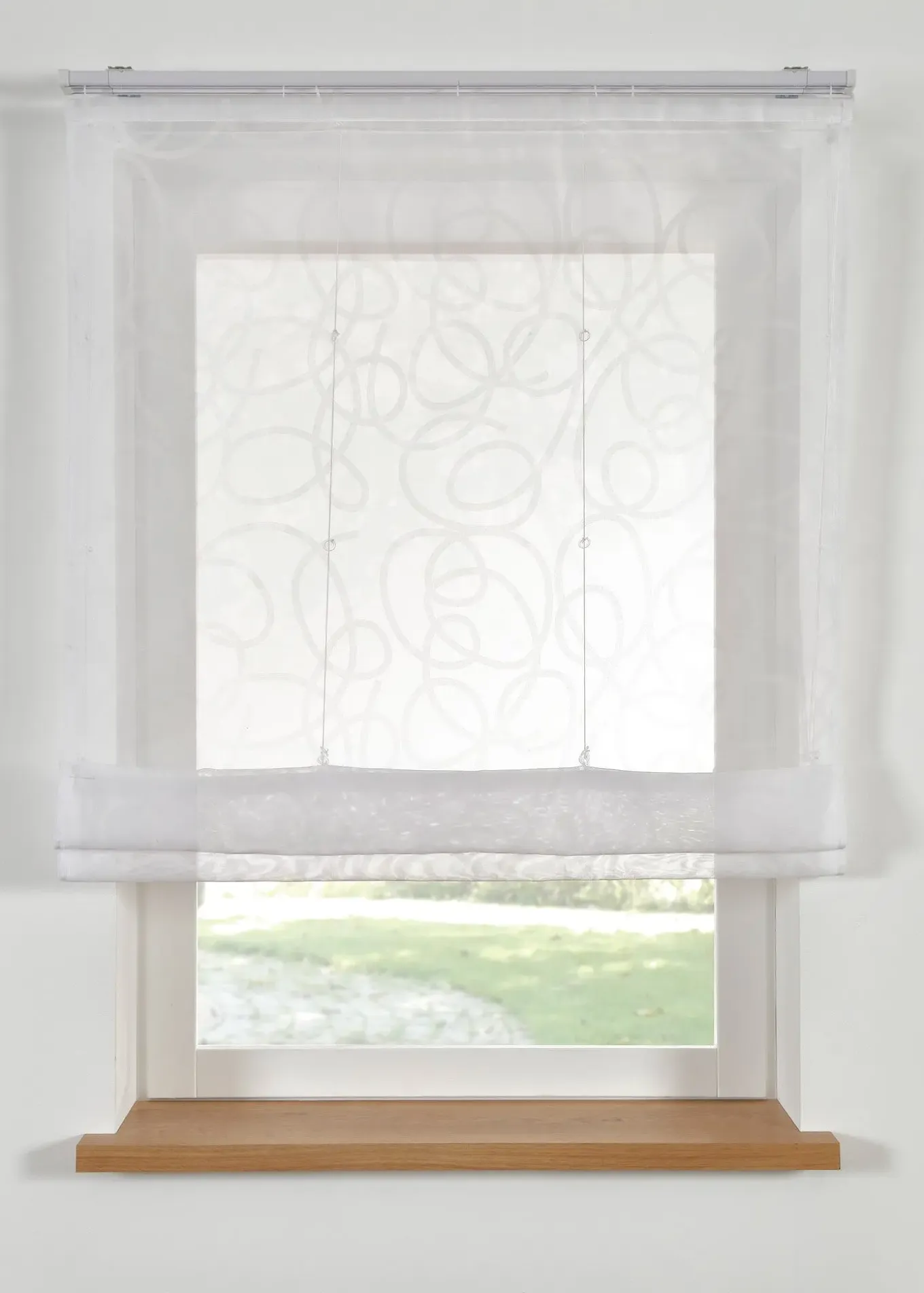 Store bateau en voile transparent à imprimé, prêt à poser avec accessoires, accrochage par bande/rail auto-agrippant ou par pattes, lavable et facile d’entretien.