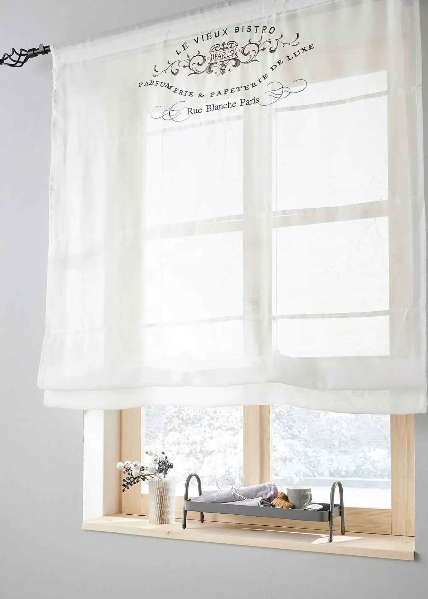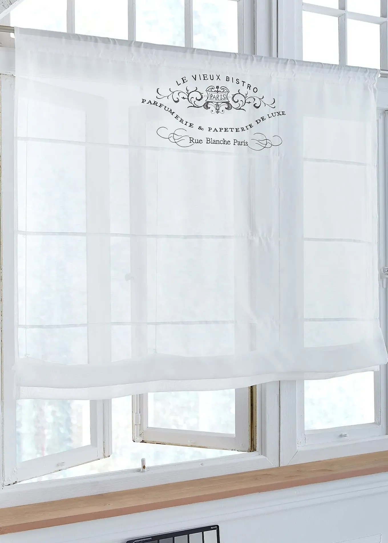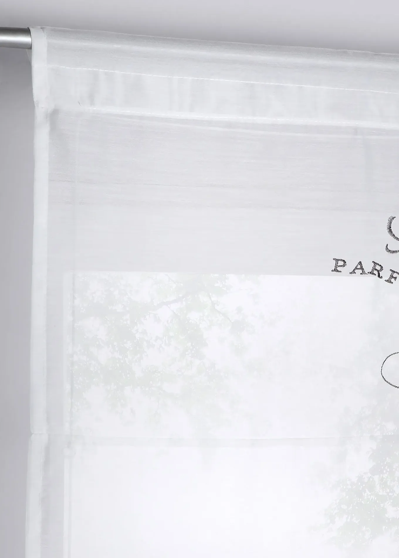 En voile transparent, imprimé et coutures décoratives, facile d’entretien, accessoires et deux barres de lestage inclus (pour lester à la base et pour fixer la partie supérieure), dimensions = dimensions du tissu, accrochage par coulisse passe-tringle.