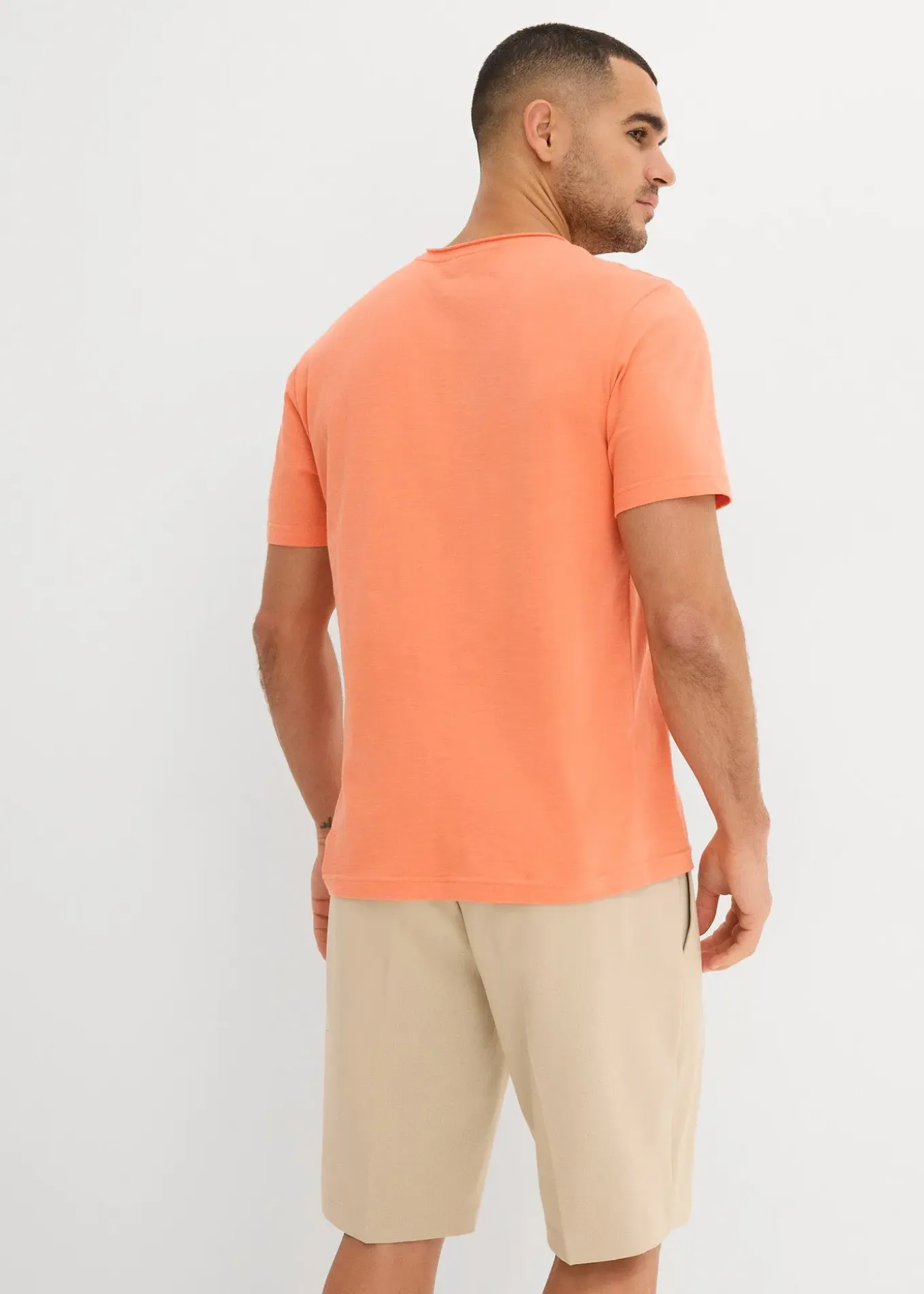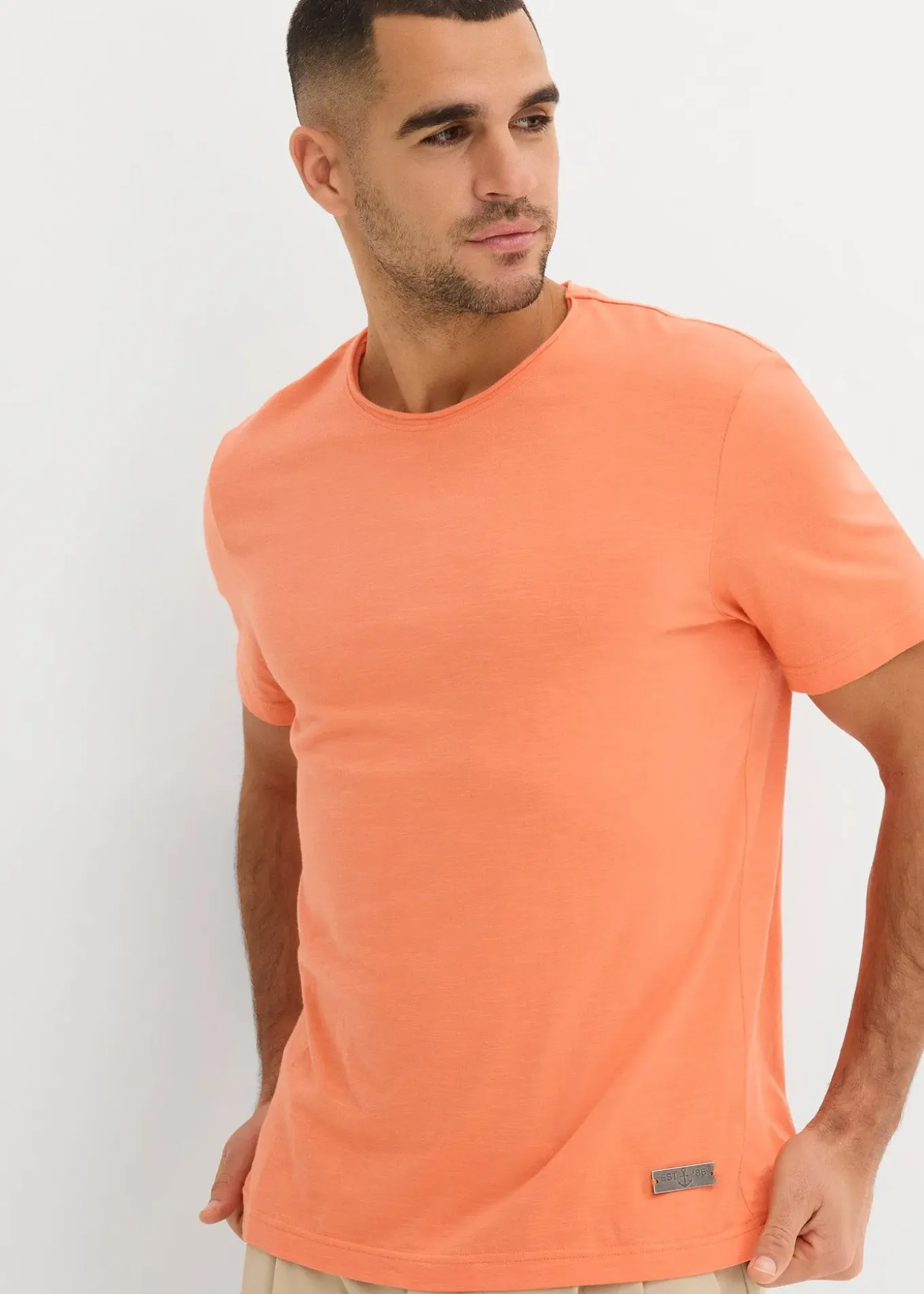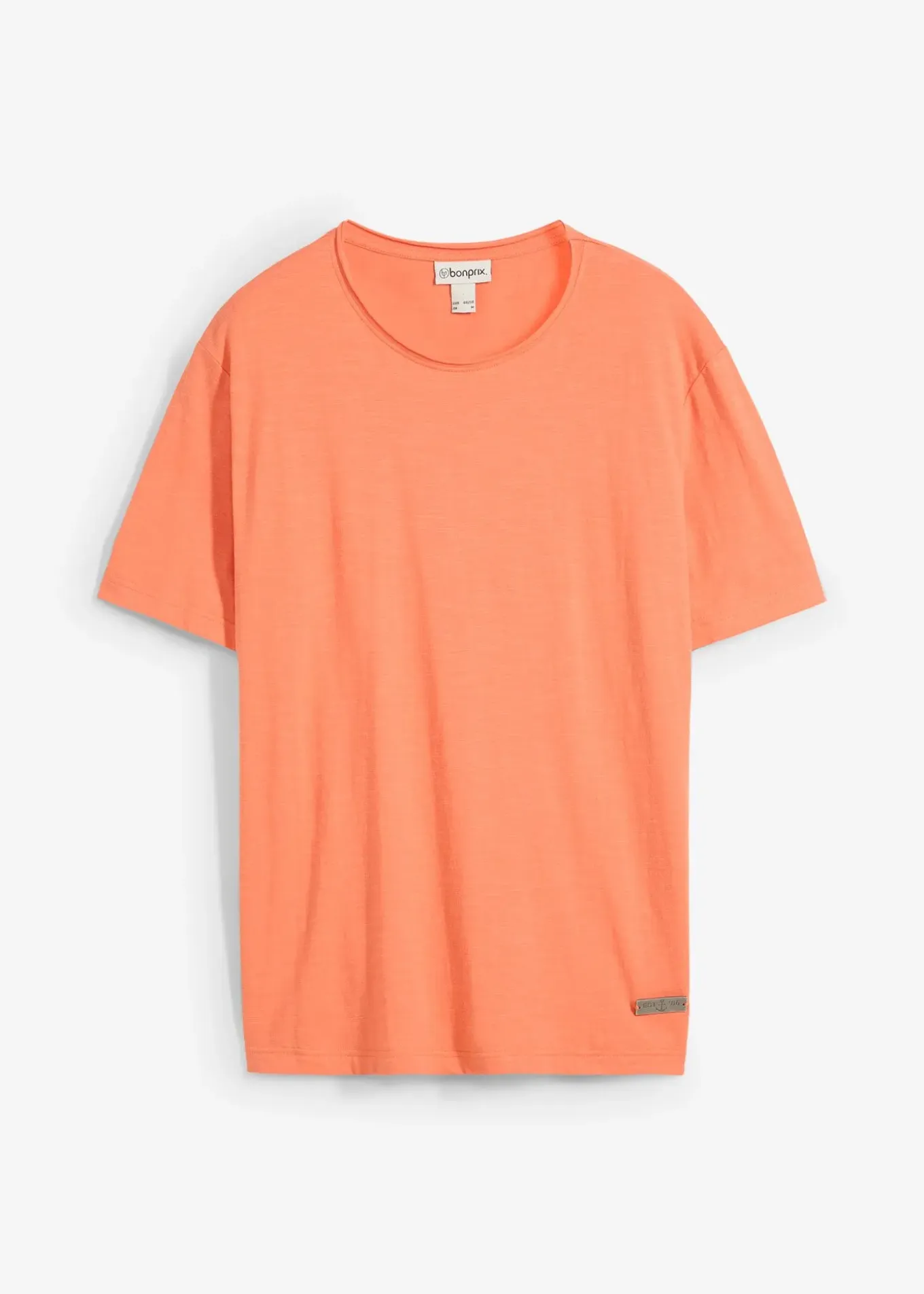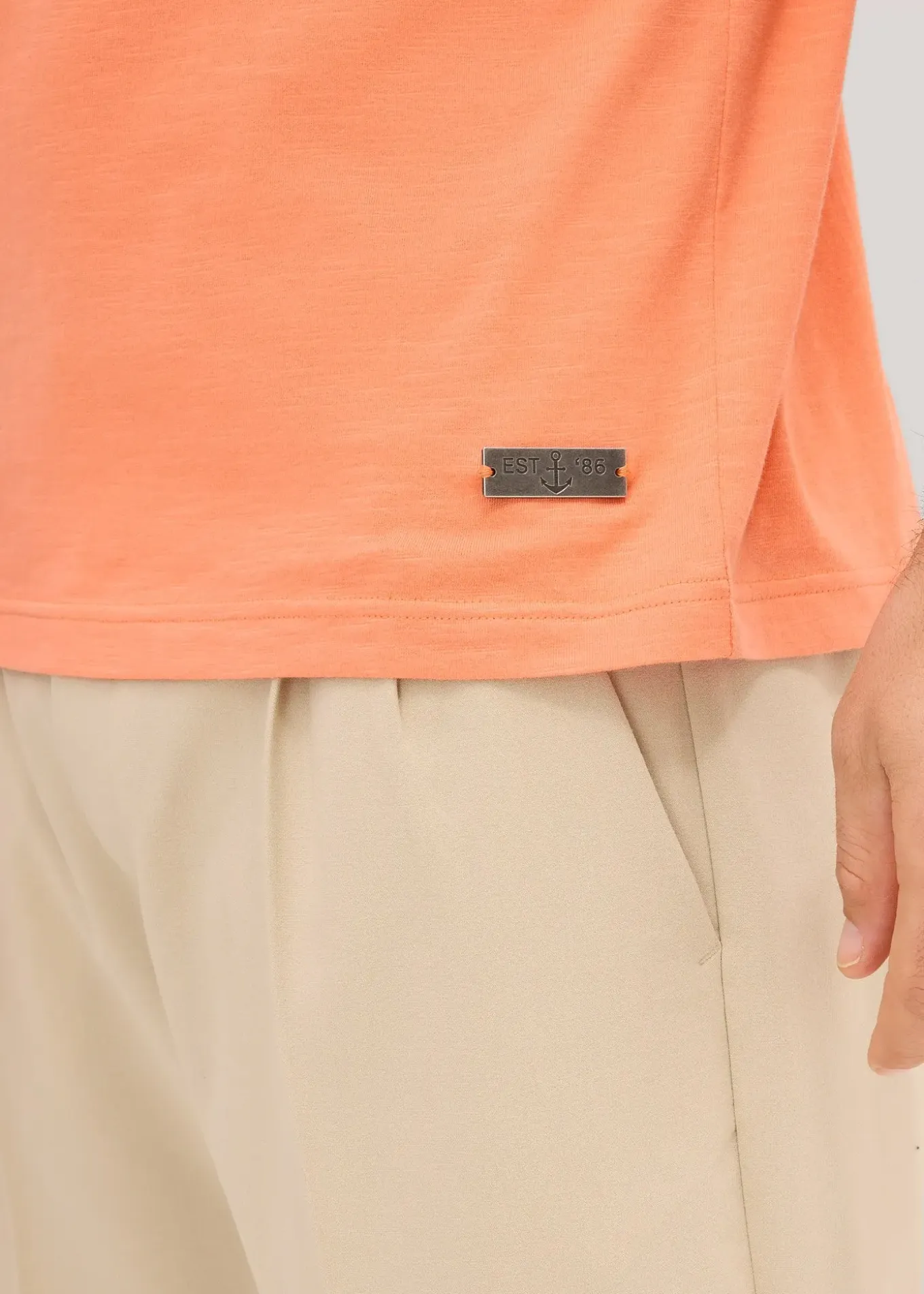T-shirt élégant à bords ouverts sur le décolleté et petite plaque métallique sur la couture latérale