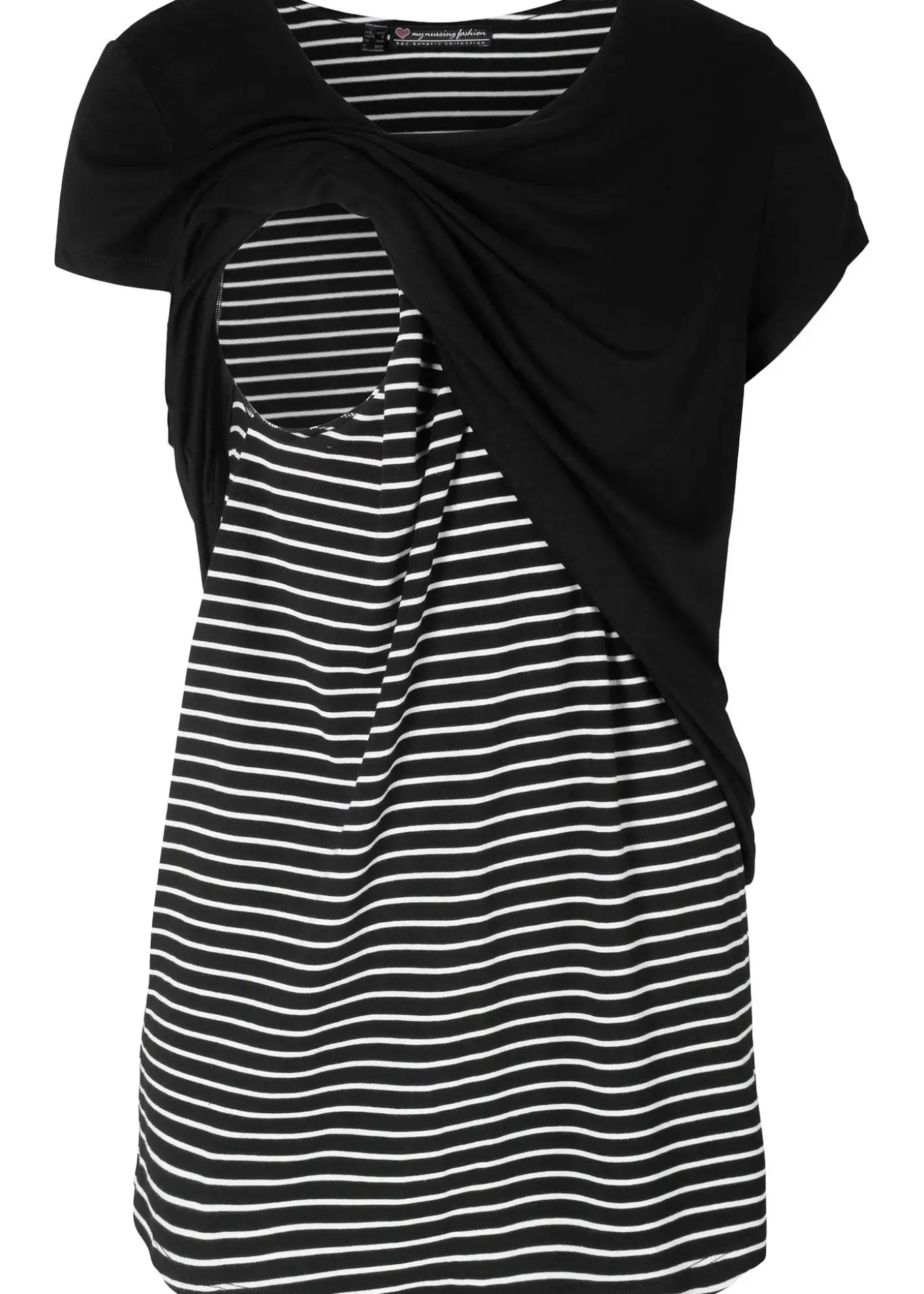 Ce T-shirt basique est un incontournable de la garde-robe de grossesse. Grâce à sa matière flexible et agréable, vous pourrez le porter dès les premiers mois de la grossesse jusqu’au terme, et même après la naissance. L’empiècement top en dessous est doté de larges fentes pratiques pour faciliter l’allaitement.