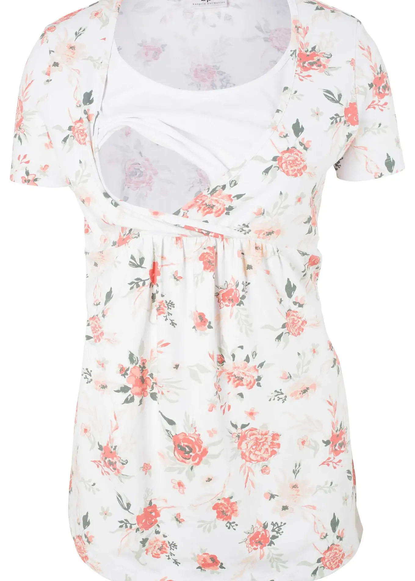 Ce T-shirt basique pour femmes enceintes confectionné dans une matière élastique et souligné à la taille convient pour toute la période de la grossesse. Il est doté d’un empiècement pratique qui s’ouvre aisément pour faciliter l’allaitement.