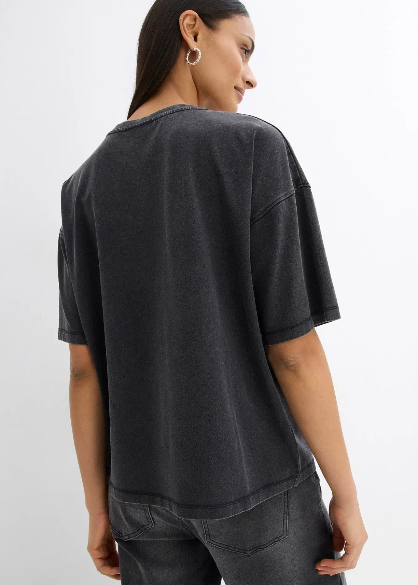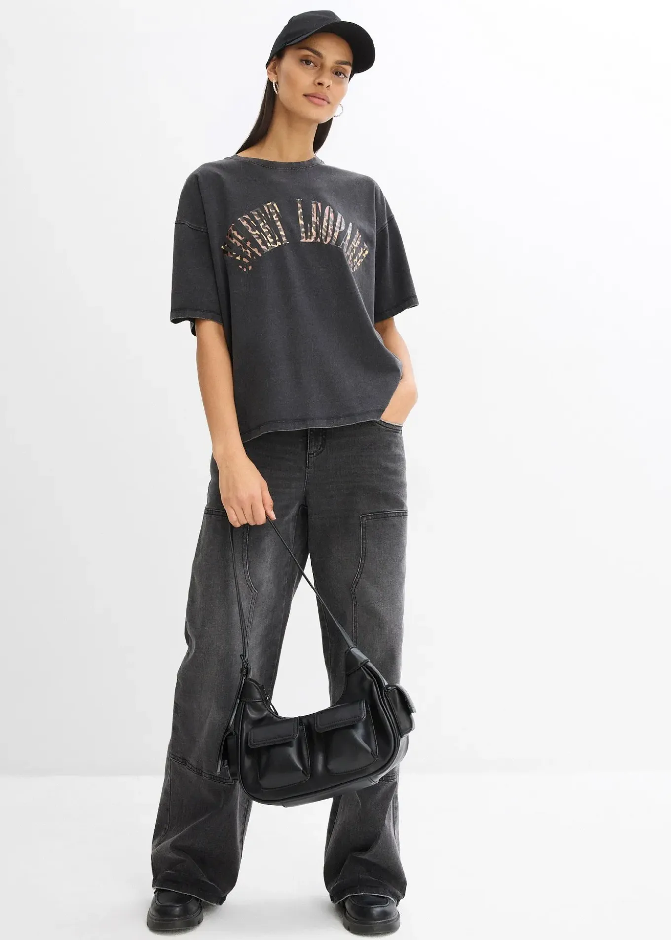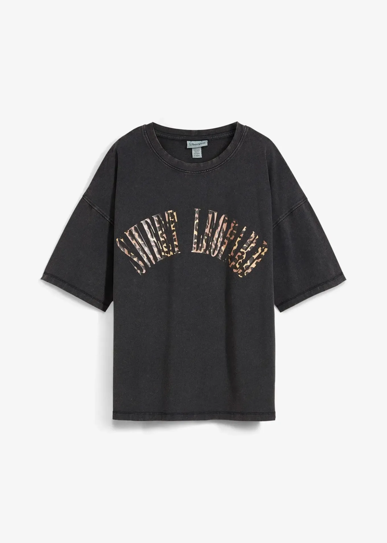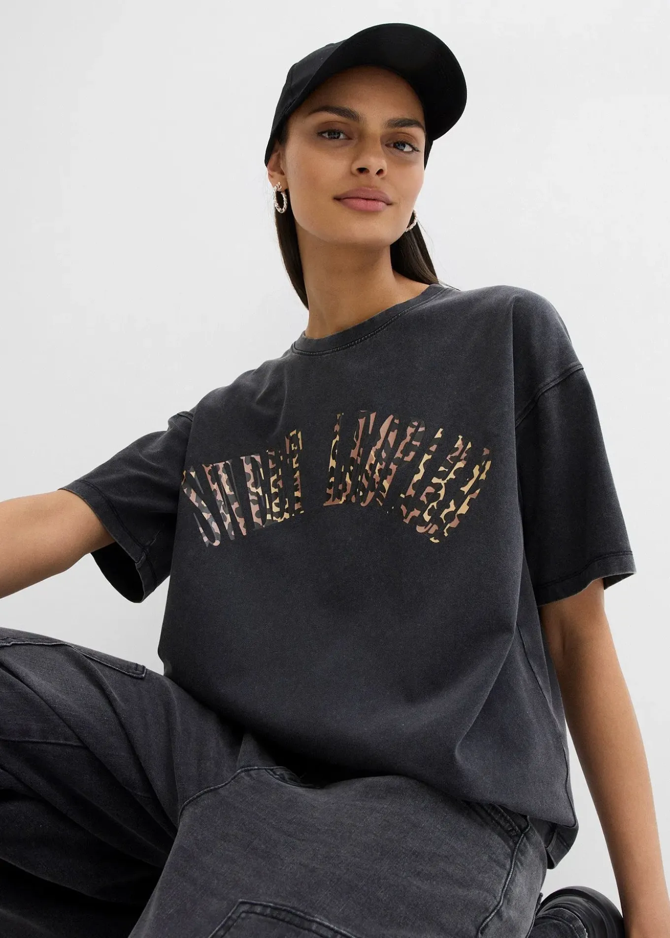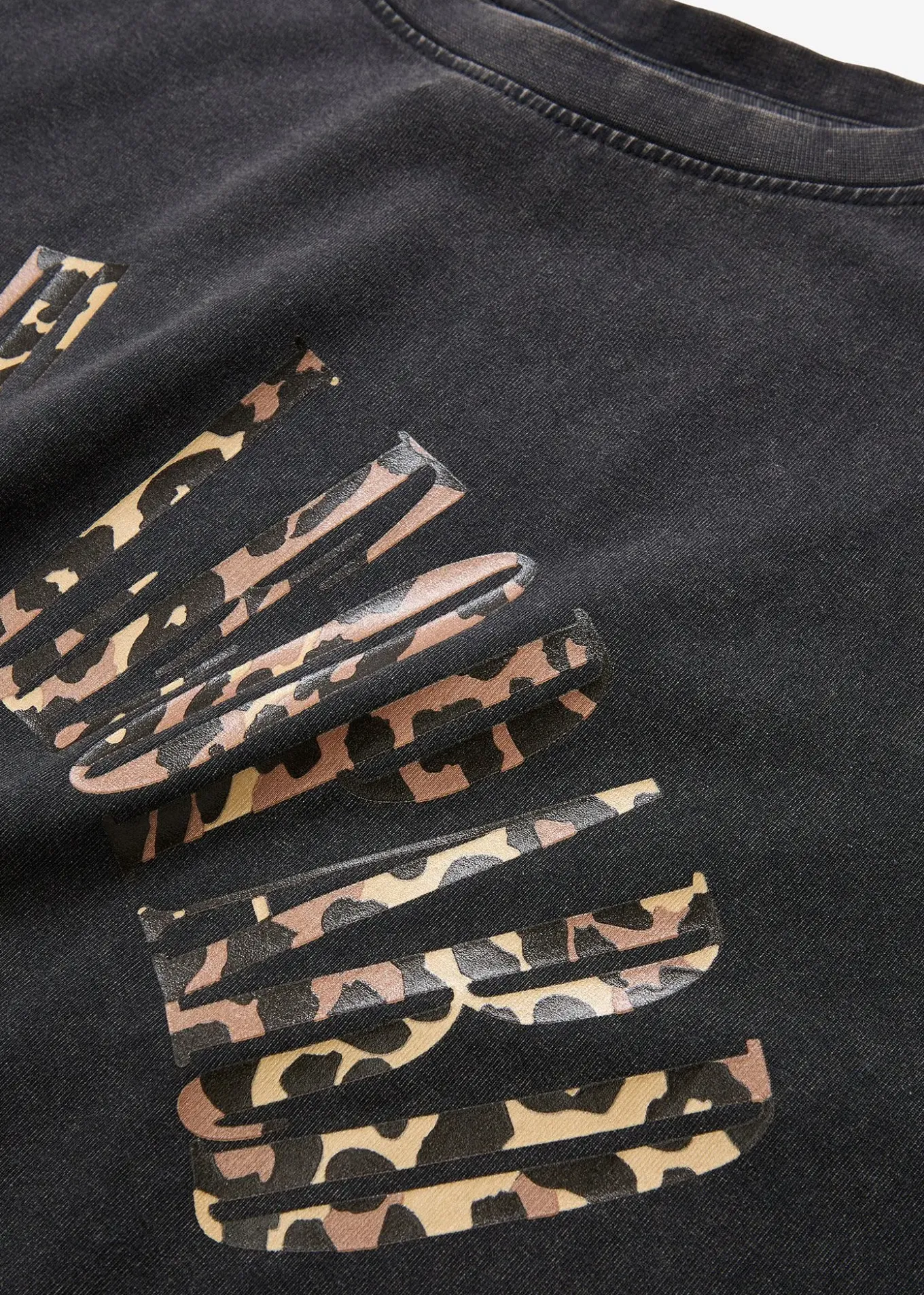 T-shirt oversize légèrement délavé avec inscription en léopard