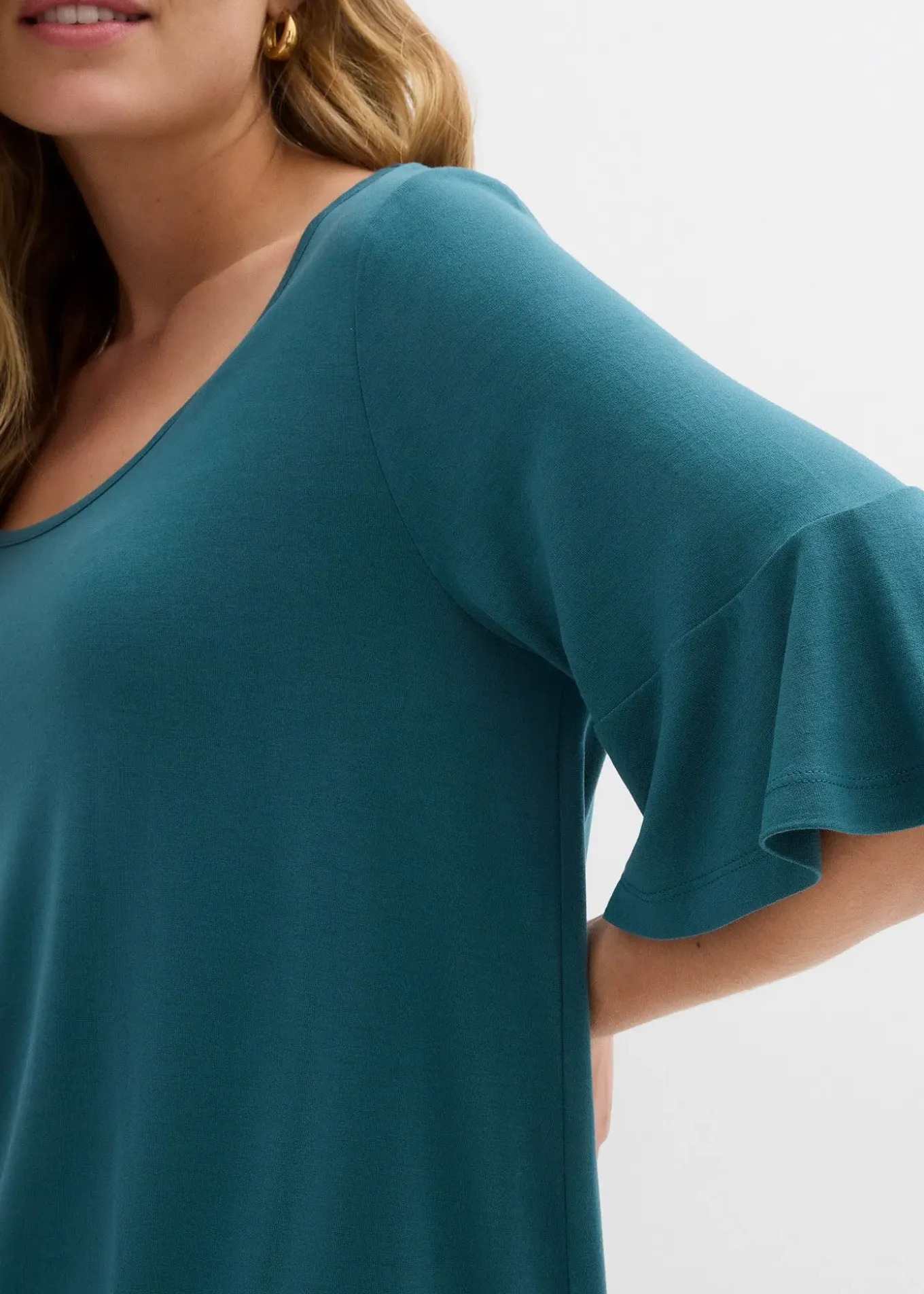 T-shirt trapèze à col rond, base arrondue et volants aux manches