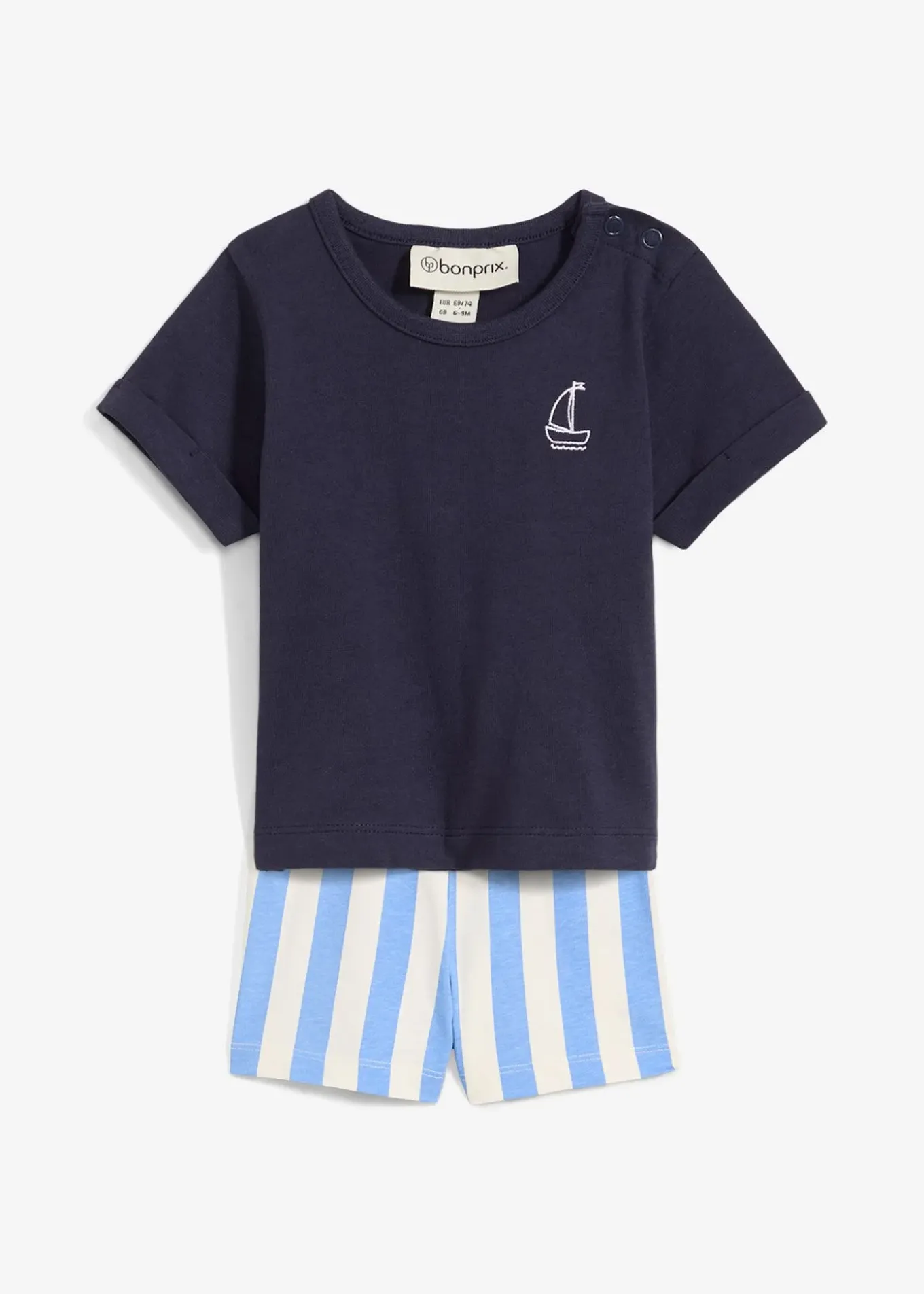 Ensemble T-shirt et short bébé 100% coton, idéal pour l’été. T-shirt avec motif bateau brodé et short rayé taille élastique et réglable pour un confort optimal.