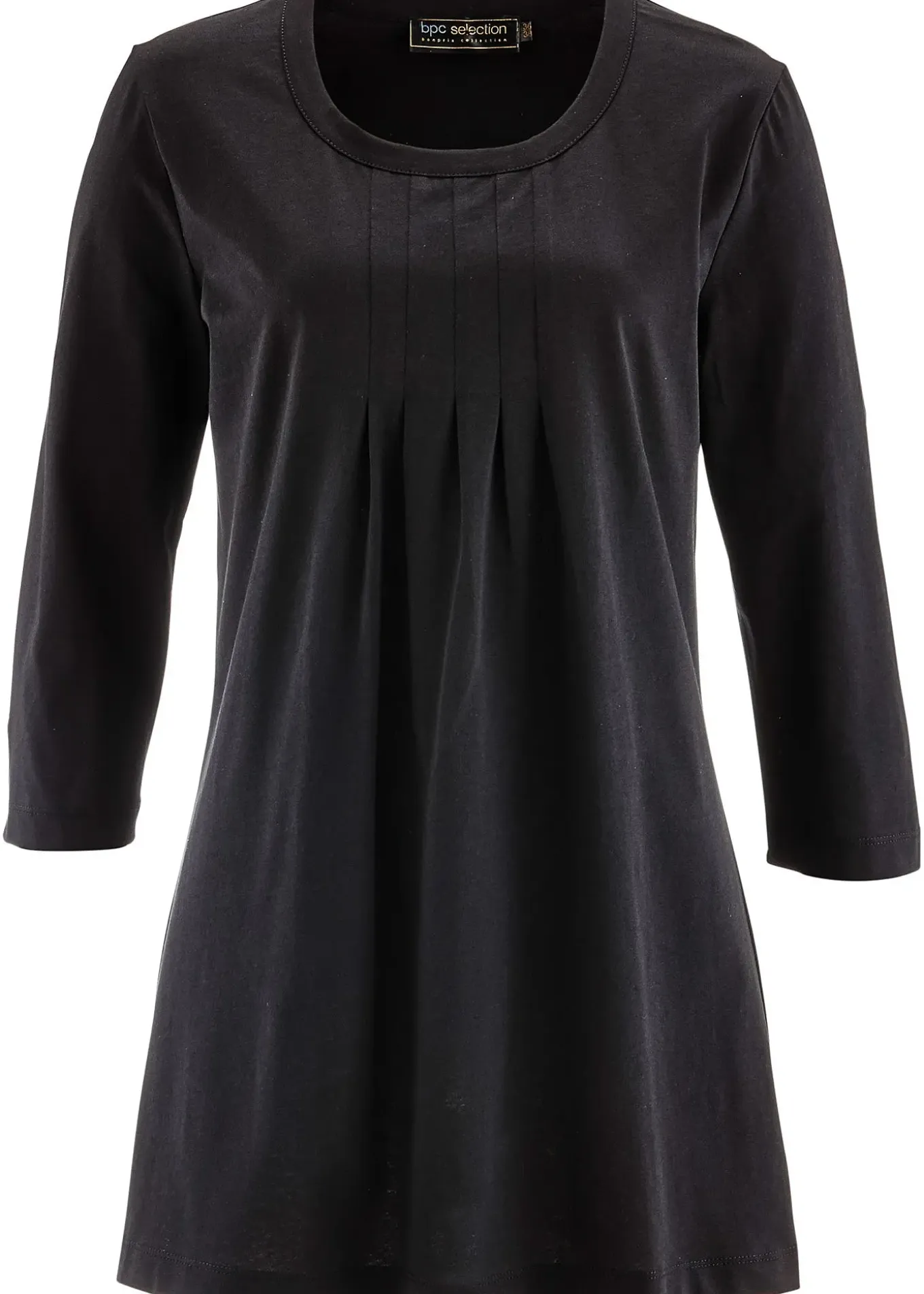 Col rond et manches 3/4, plis piqués sous la poitrine, belle longueur flatteuse, long. d’env. 76 cm à 82 cm, lavage machine.