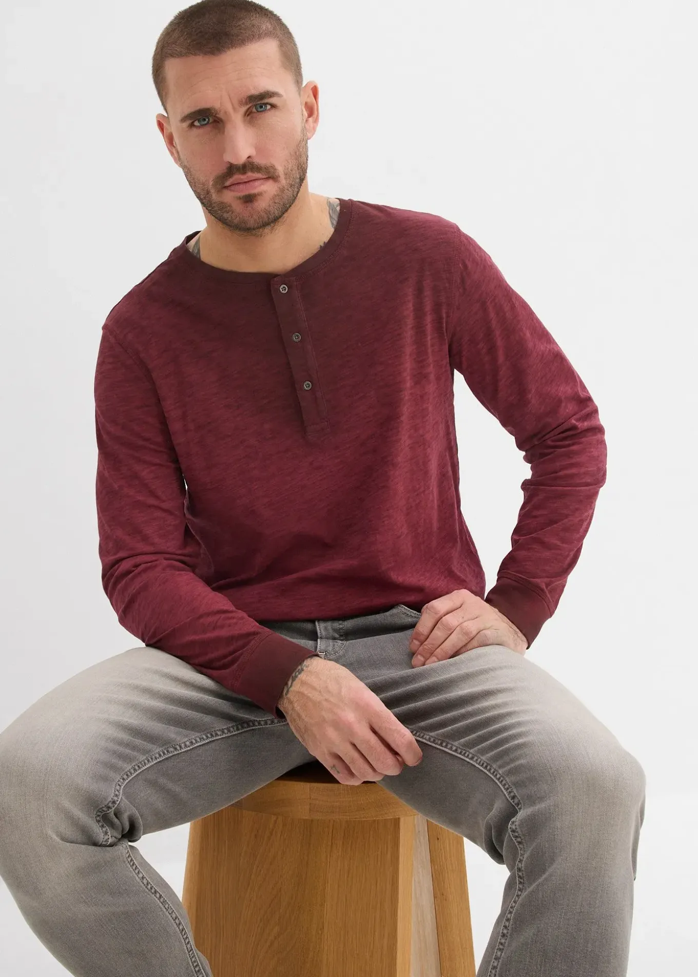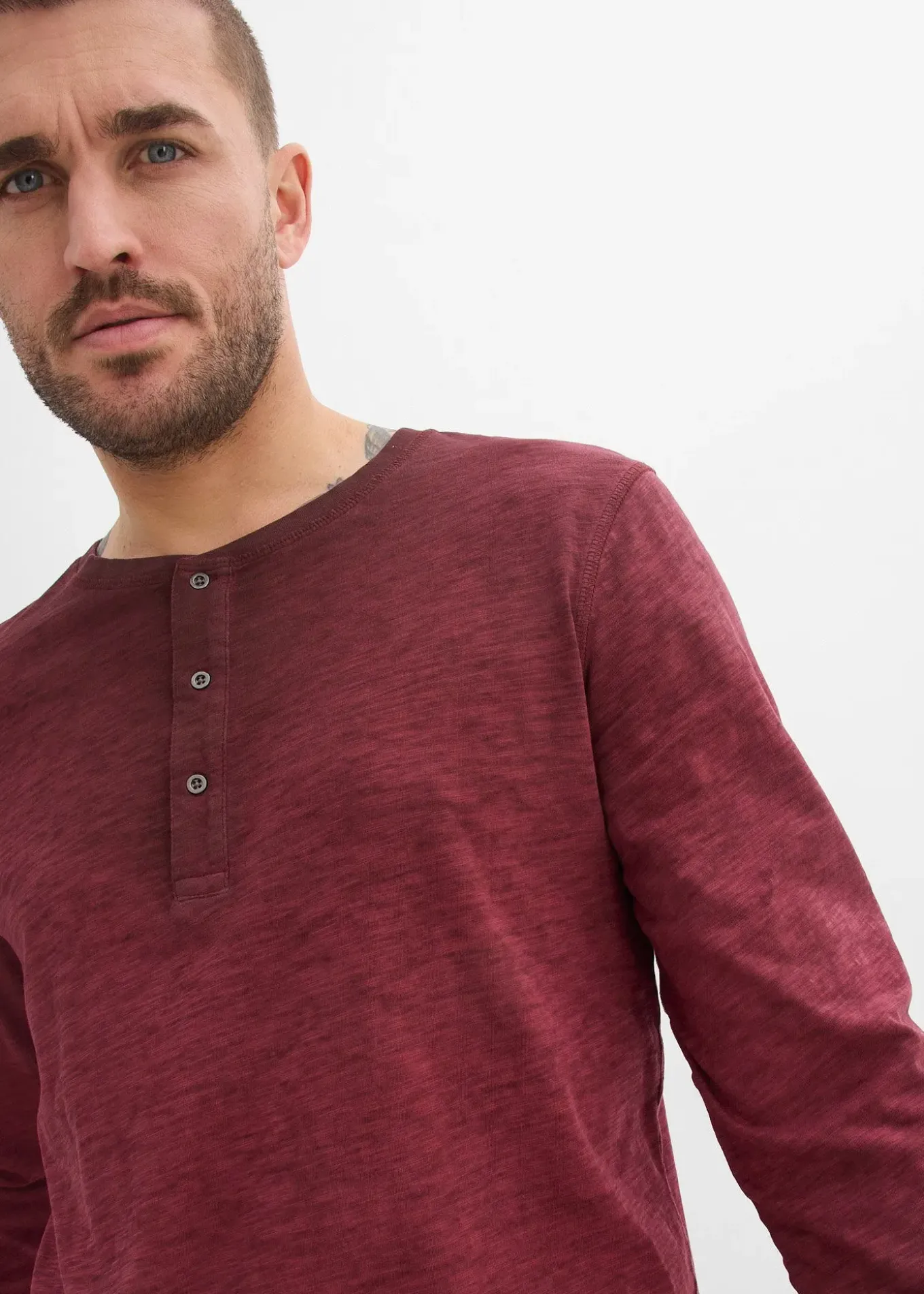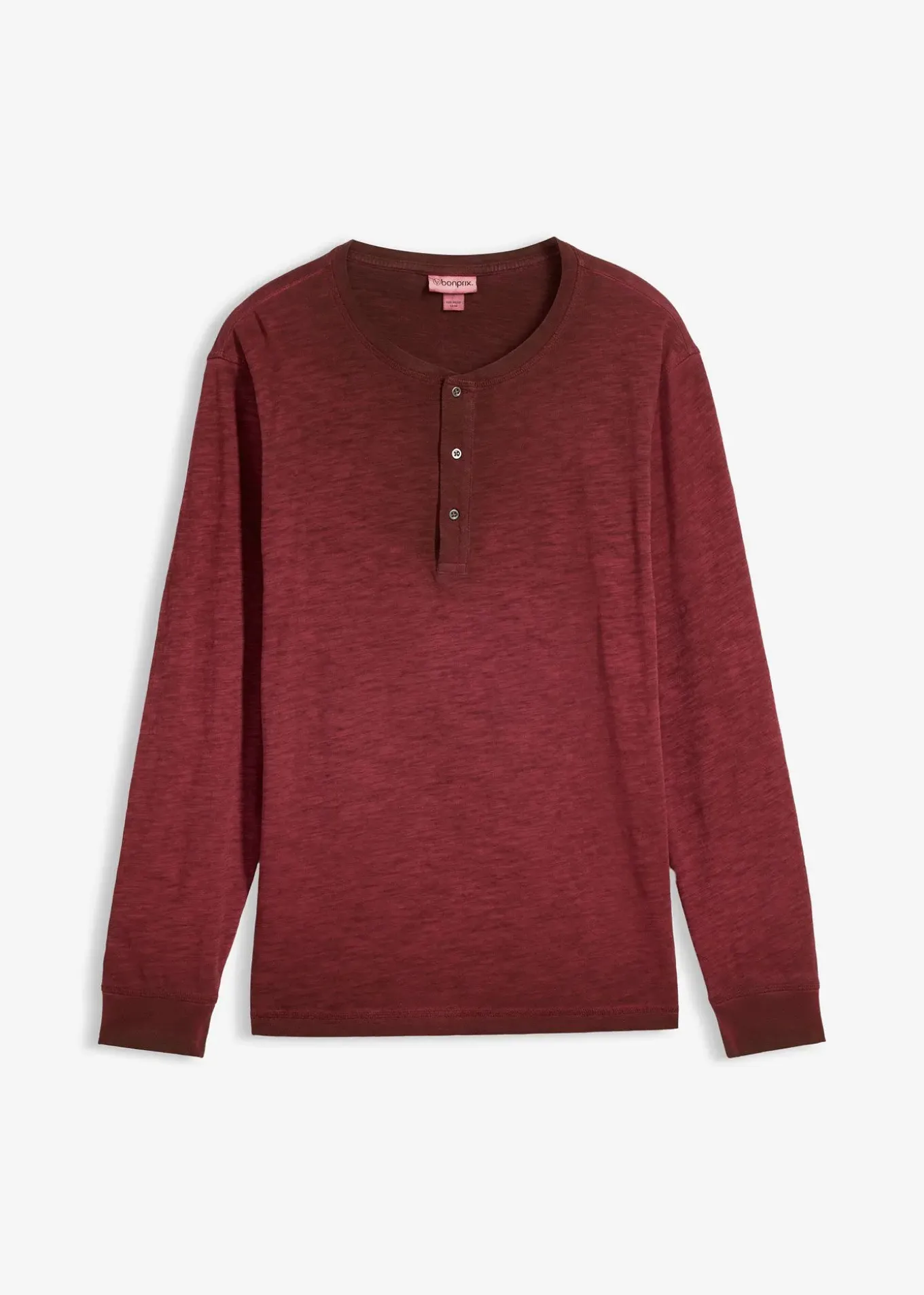 T-shirt décontracté à col tunisien et manches longues avec patte de boutonnage, délavage OIL DYED et boutons en métal, chaque pièce est unique