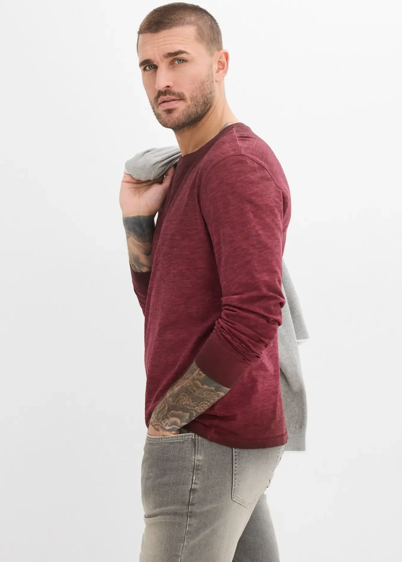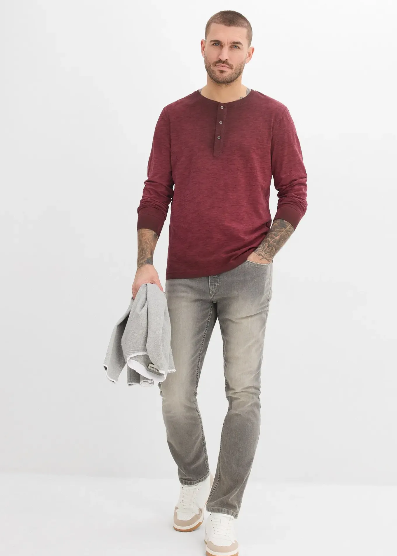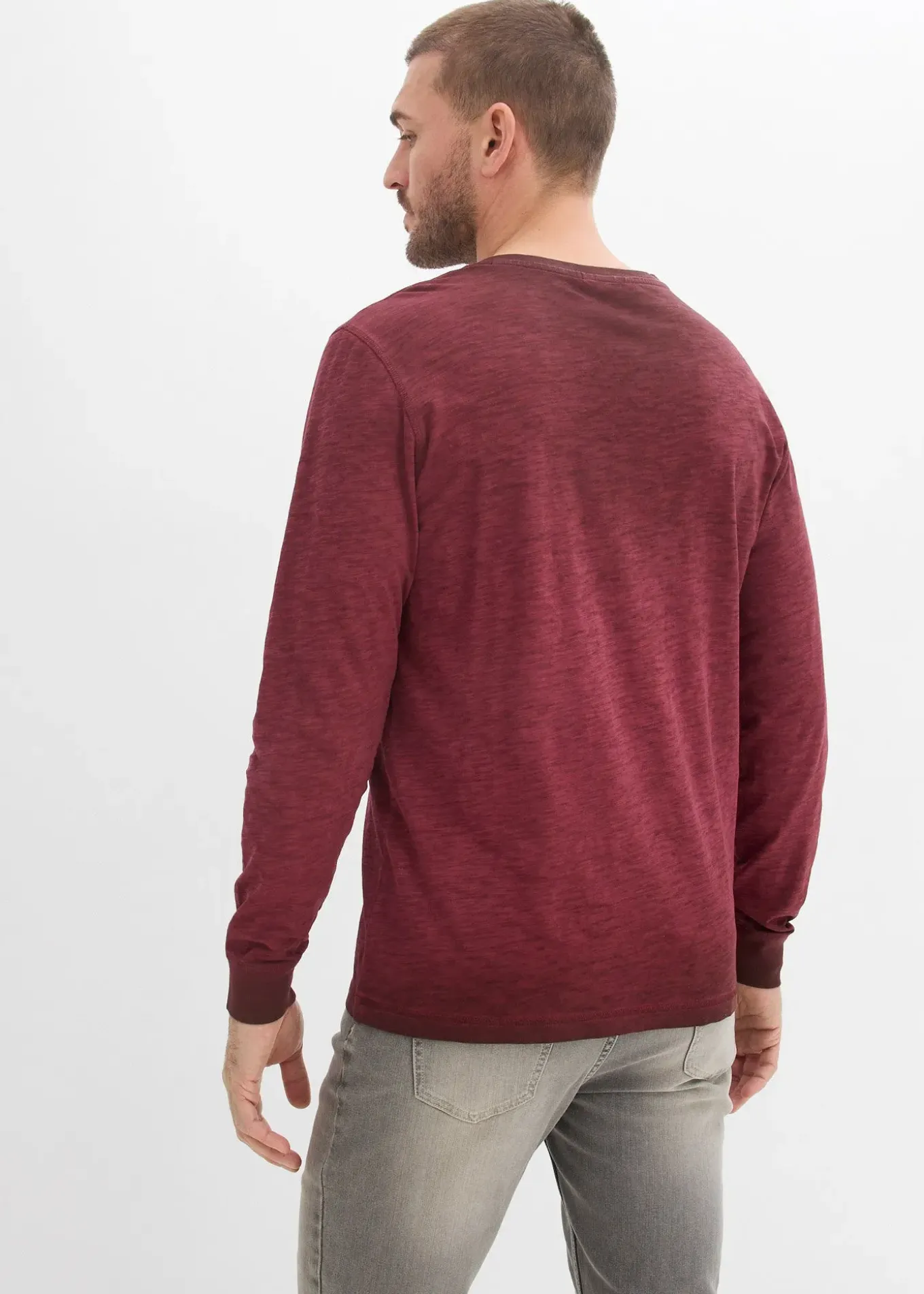 T-shirt décontracté à col tunisien et manches longues avec patte de boutonnage, délavage OIL DYED et boutons en métal, chaque pièce est unique