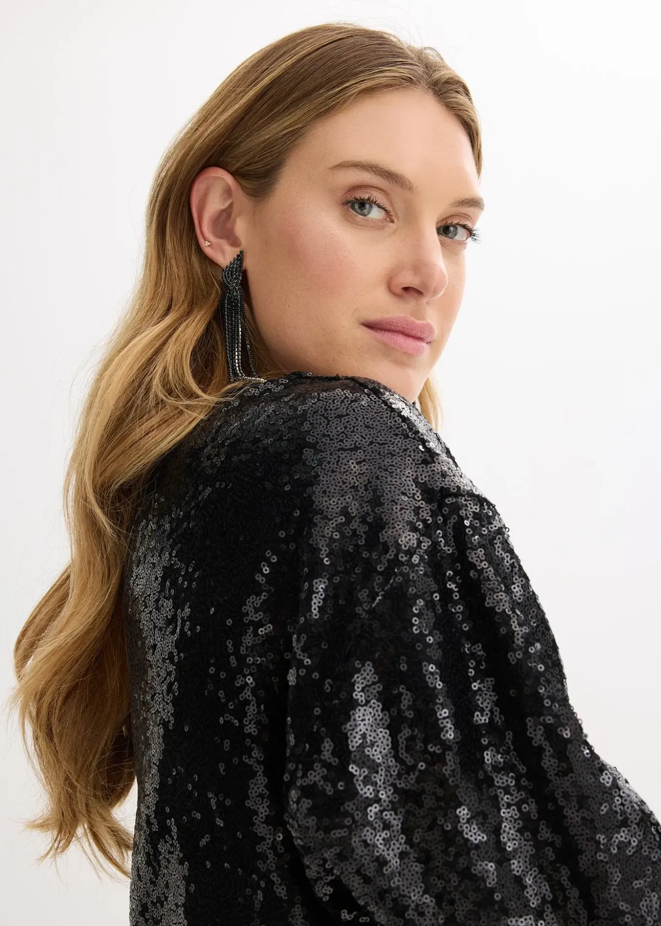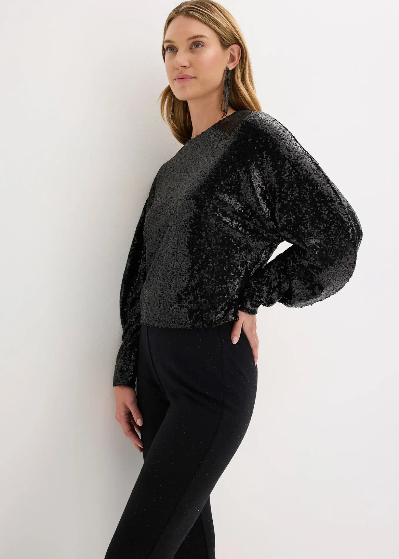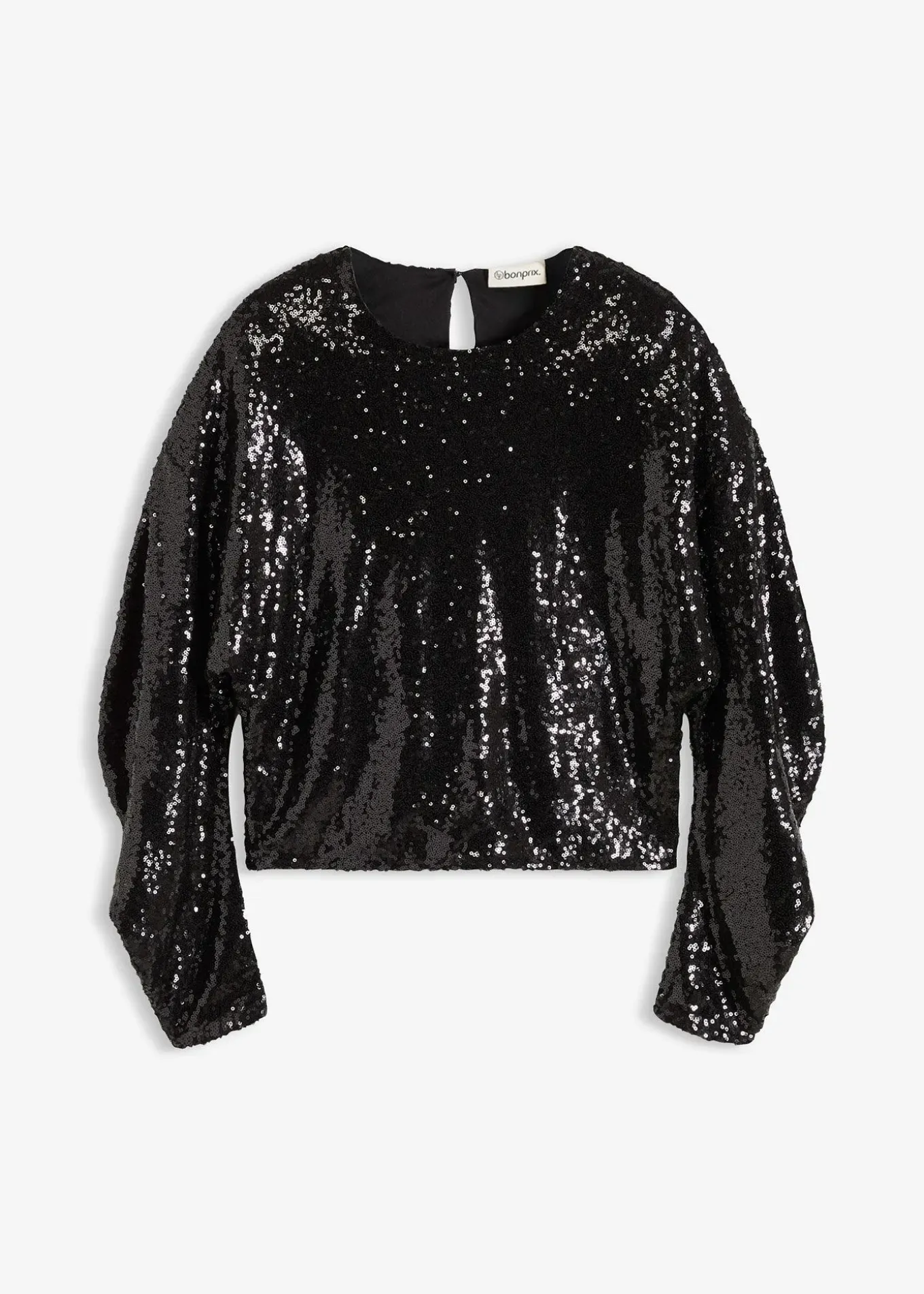 T-shirt à sequins tendance avec manches longues et volumineuses de coupe ovoïde, fermé par un bouton au dos