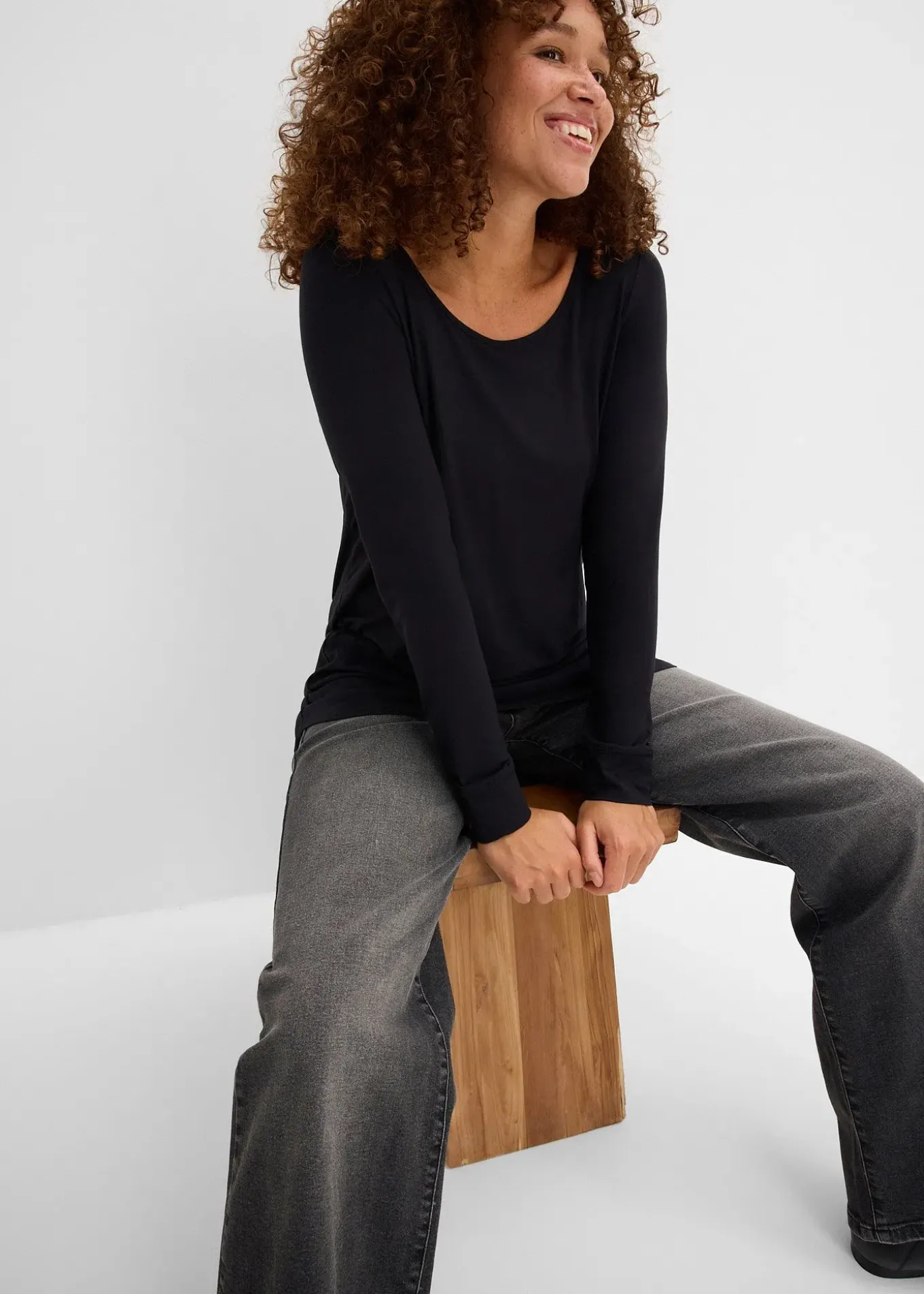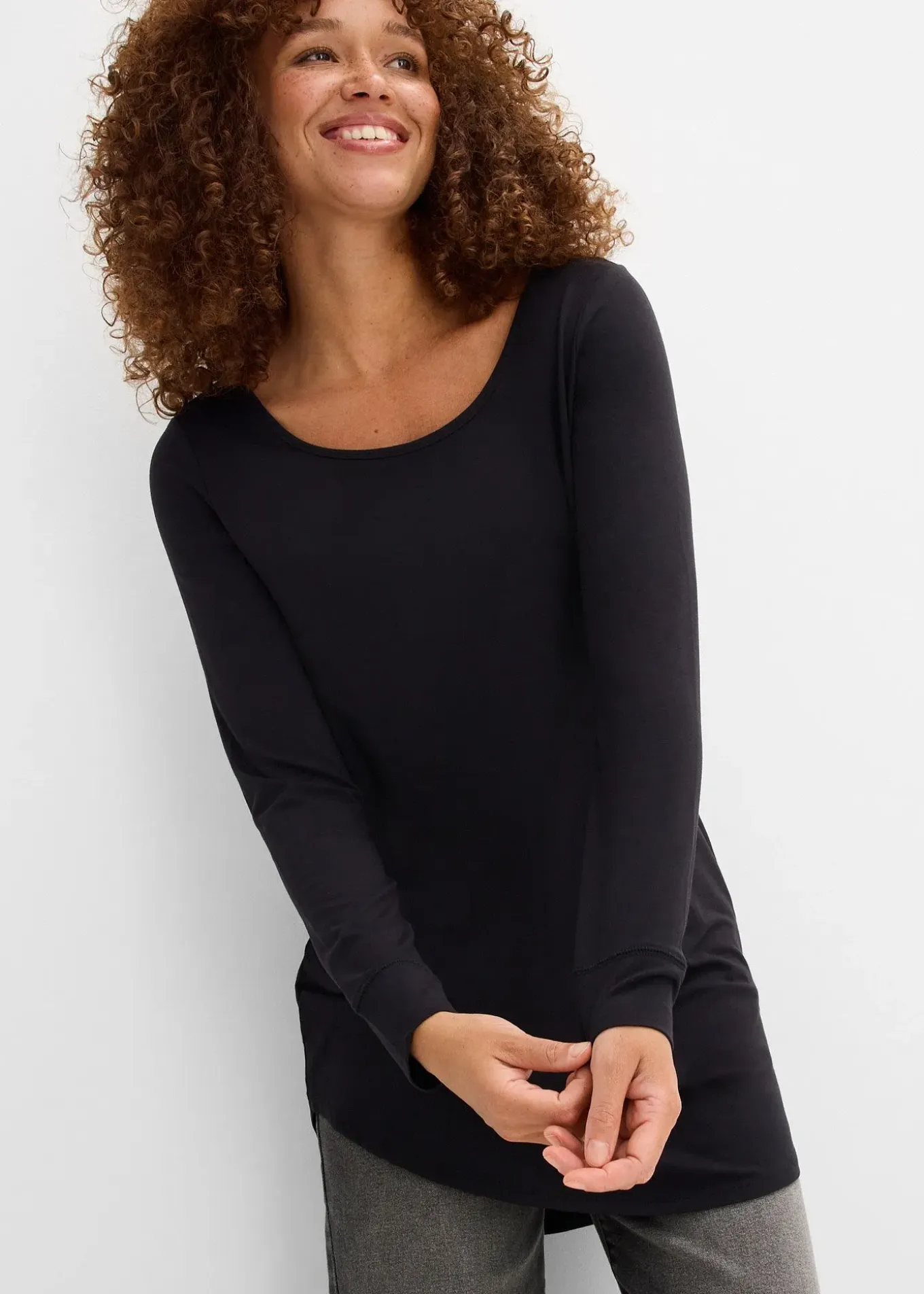 Ce T-shirt long à manches longues et de coupe épurée permet de multiples associations. La belle encolure bateau souligne le décolleté et mettra vos bijoux en valeur. Ce modèle de bpc collection plus long et légèrement près du corps est plus long derrière que devant.Un legging à motif, des bottes et un collier imposant donneront à ce T-shirt long à manches longues une allure mode. Un jean extensible et des baskets lui donneront un look idéal au quotidien. Combiner avec un gros gilet en laine pour un confort absolu.